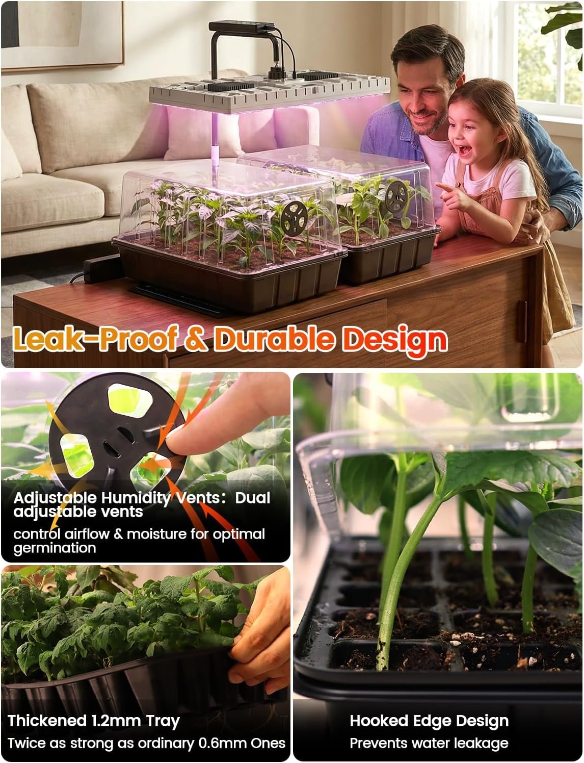Heavy-Duty & Leakproof:Reinforced 1.2mm thick seed trays (2× stronger than standard 0.6mm trays) help prevent bending and warping during use. Leakproof ridge design helps reduce water dripping onto your heating mat or table—ideal for garden trays, grow trays, seed planting trays, and reusable propagation setups.