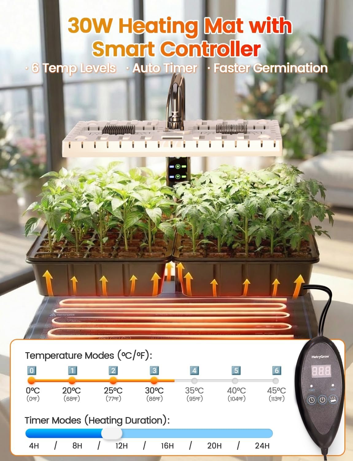 Faster Germination:The 30W heating mat supports germination by helping maintain stable soil temperature. With 6 temperature levels + auto timer, it’s ideal for peppers, tomatoes, herbs, seed sprouting kits, cloning tray setups, and mushroom growing. More consistent than non-heated germination trays.