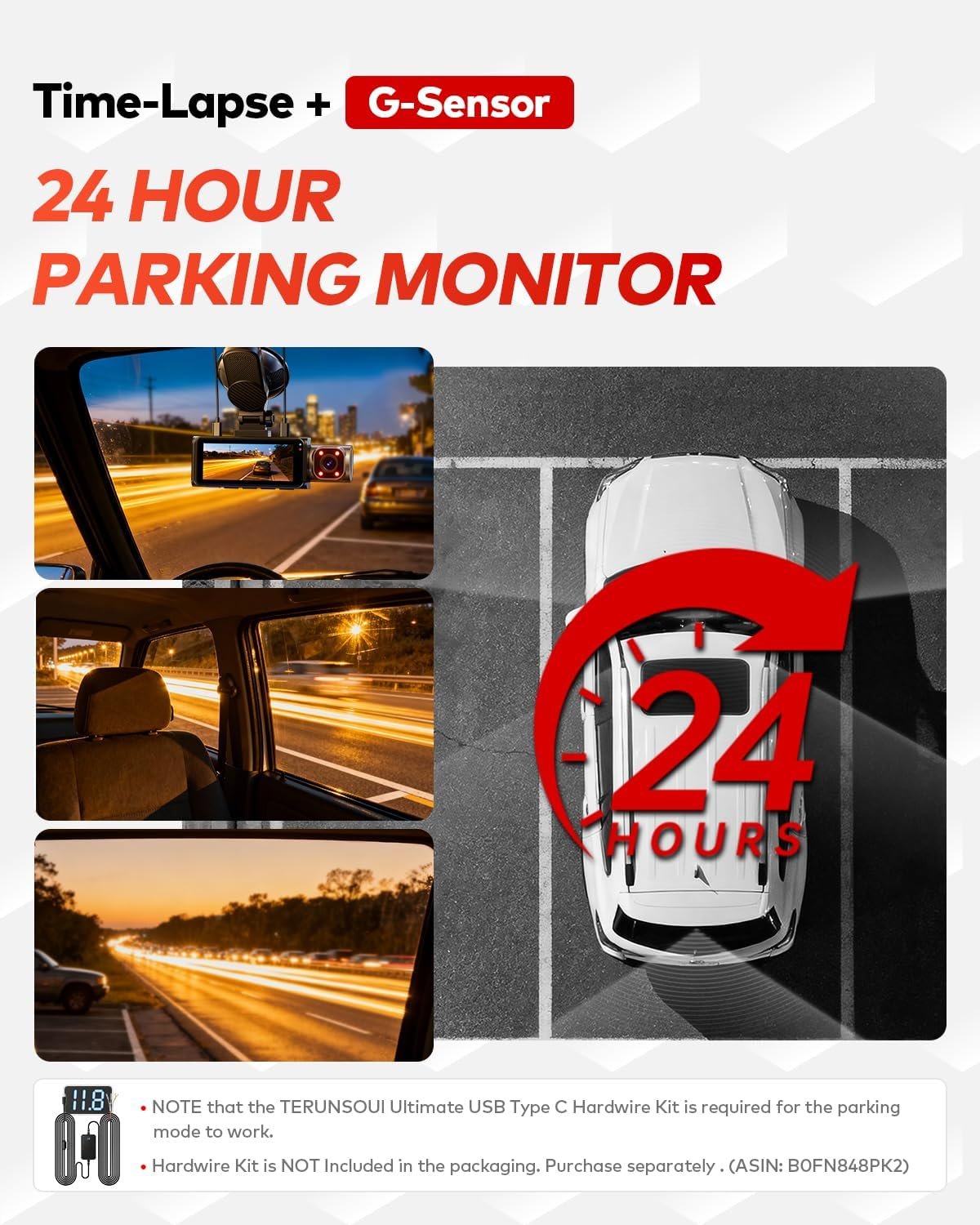 24-Hour Parking Monitoring: Protect your vehicle with time-lapse recording and collision detection to monitor potential damage or theft. The car camera supports time-lapse video mode, recording continuously for 24 hours at a low frame rate and low power consumption, capturing 1/2/5 frames per second. When the vehicle is parked, any collision event will automatically trigger recording and lock the video. Please note: A separate hardwire kit is required for parking mode(ASIN:B0FN848PK2)