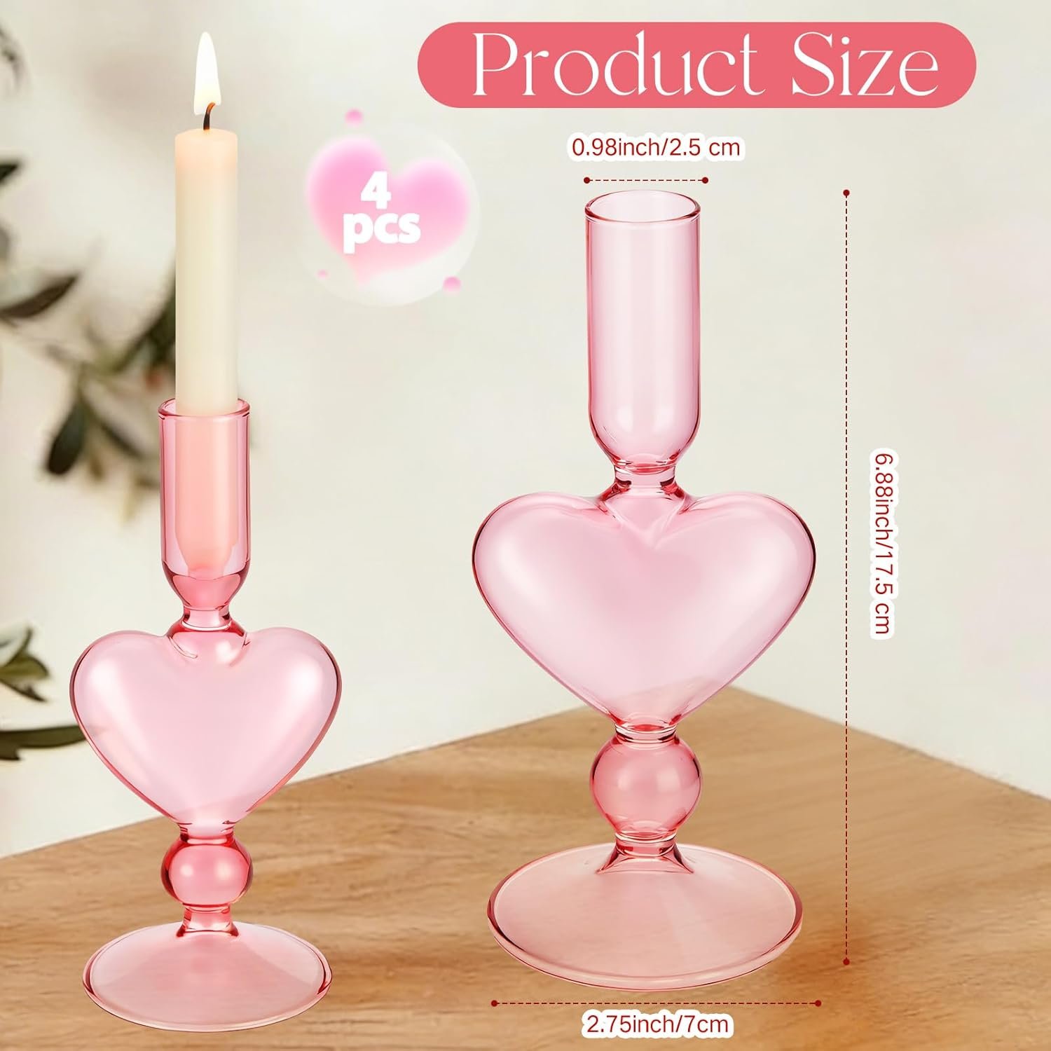 Valentines Heart Candlestick: the package contains 4 pink heart-shaped glass candlesticks; The base diameter is 2.75 inches and the candlestick height is 6.9 inches; The size is moderate and very suitable for decorating your Valentine’s Day themed party