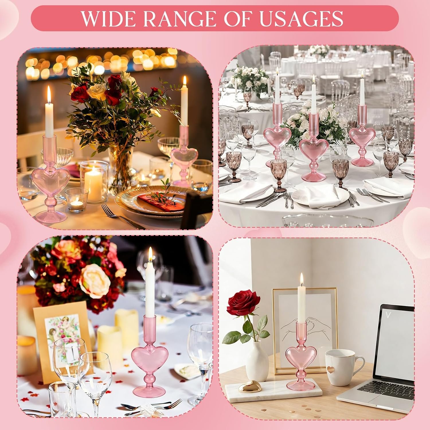 Materials: our playful pink heart candle holder is made of lead-free glass; It is transparent, durable and well-packaged; It is safe and reliable; The candle holders are properly weighted to prevent them from tipping over when burning, making them convenient to use; You can place the candle holders on a shelf or table to make them the center of attention at the party