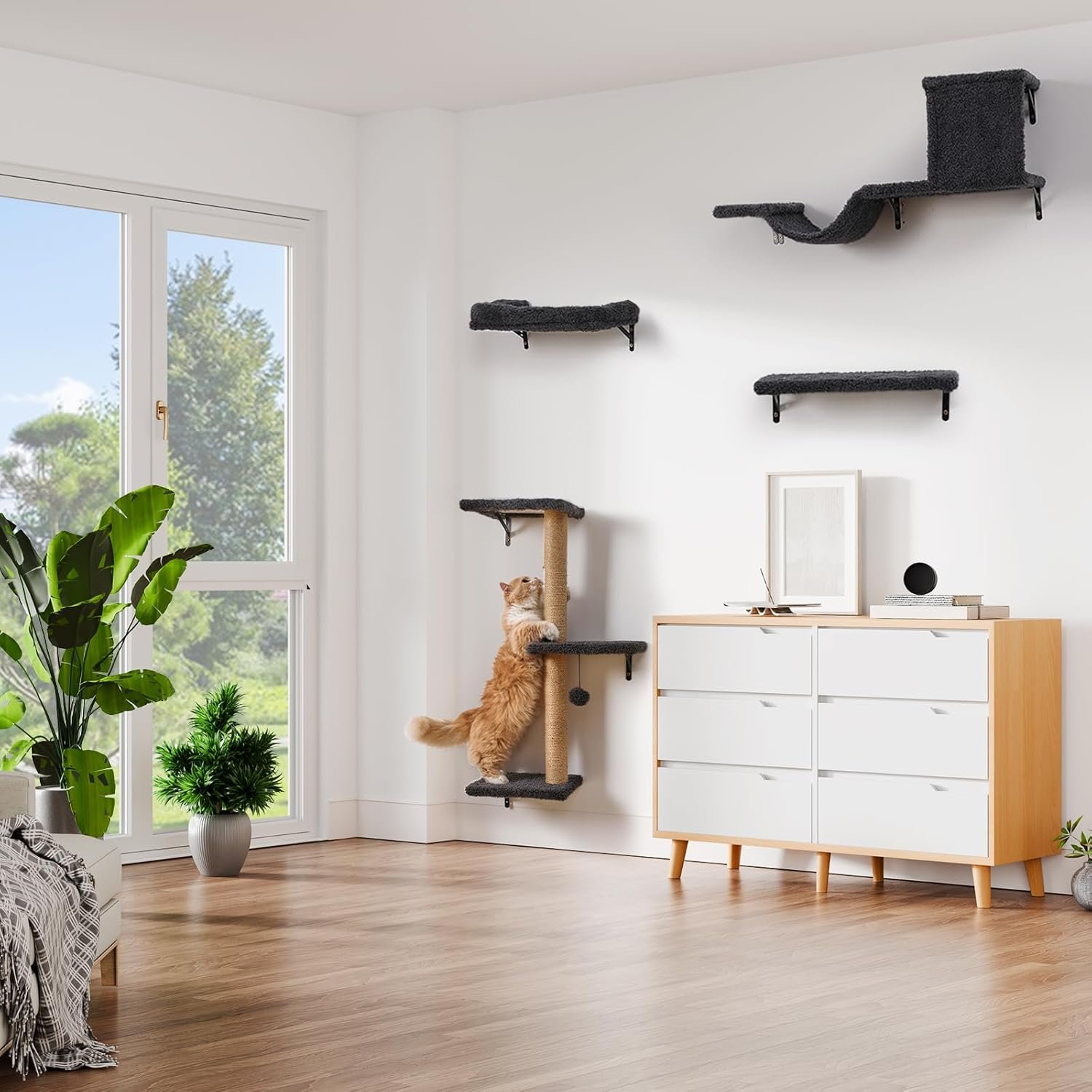 Effortless Setup, Instant Cat Paradise! Our ingenious multi-functional cat climbing shelves is designed for victory. Imagine: in minutes, not hours, you’ll be transforming that blank wall into a thrilling cat climbing wall systems. Clear instructions, smart design, and frustration-free parts mean anyone can be the hero who builds the ultimate cat playground. Whether it’s a sun-drenched balcony lookout, a cozy corner in your bedroom retreat, the heart of the living room action, floating cat shelves seamlessly adapts – turning your entire home into their personal, vertical kingdom.