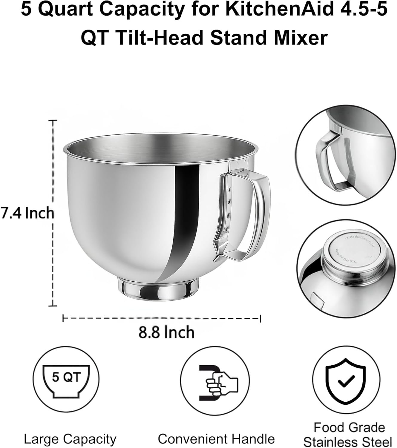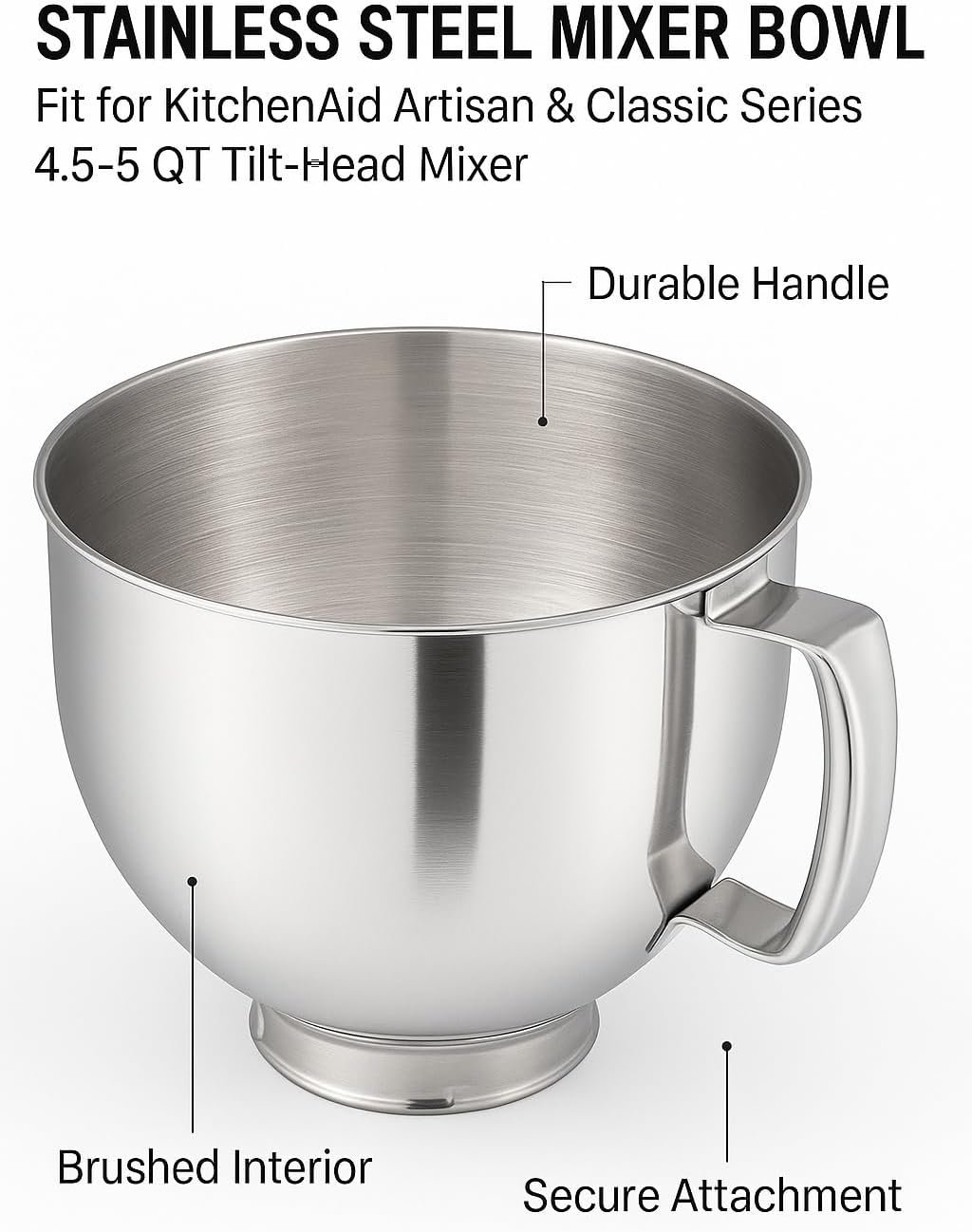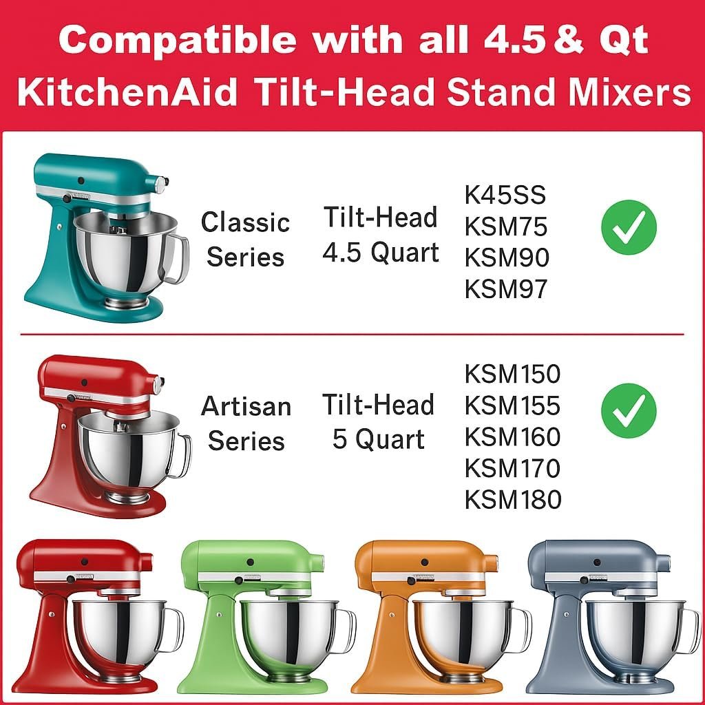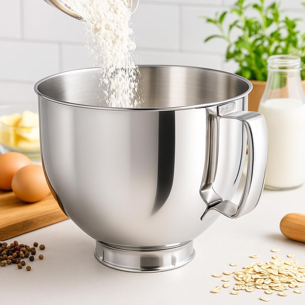 Upgrade your baking experience with durable stainless steel mixing bowls compatible with 4.5–5 quart tilt-head stand mixers, perfect for whipping, mixing, and kneading.