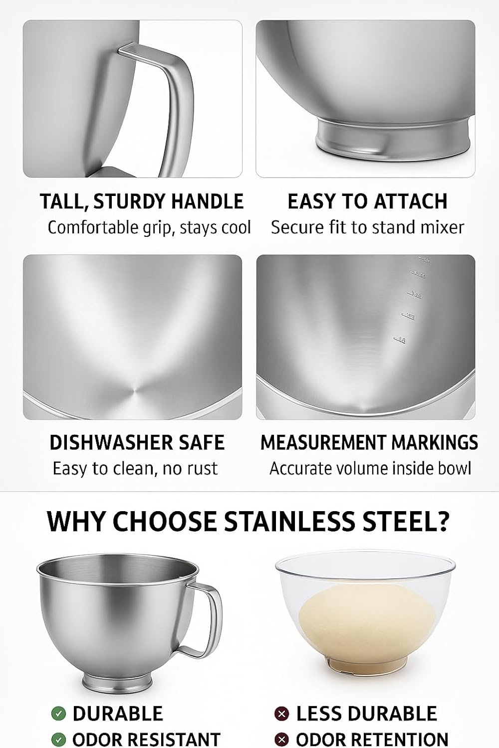 This stainless steel mixer bowl accessory is dishwasher safe, rust-resistant, and built for long-lasting daily use.