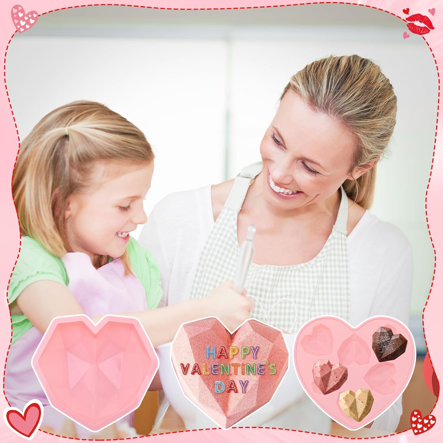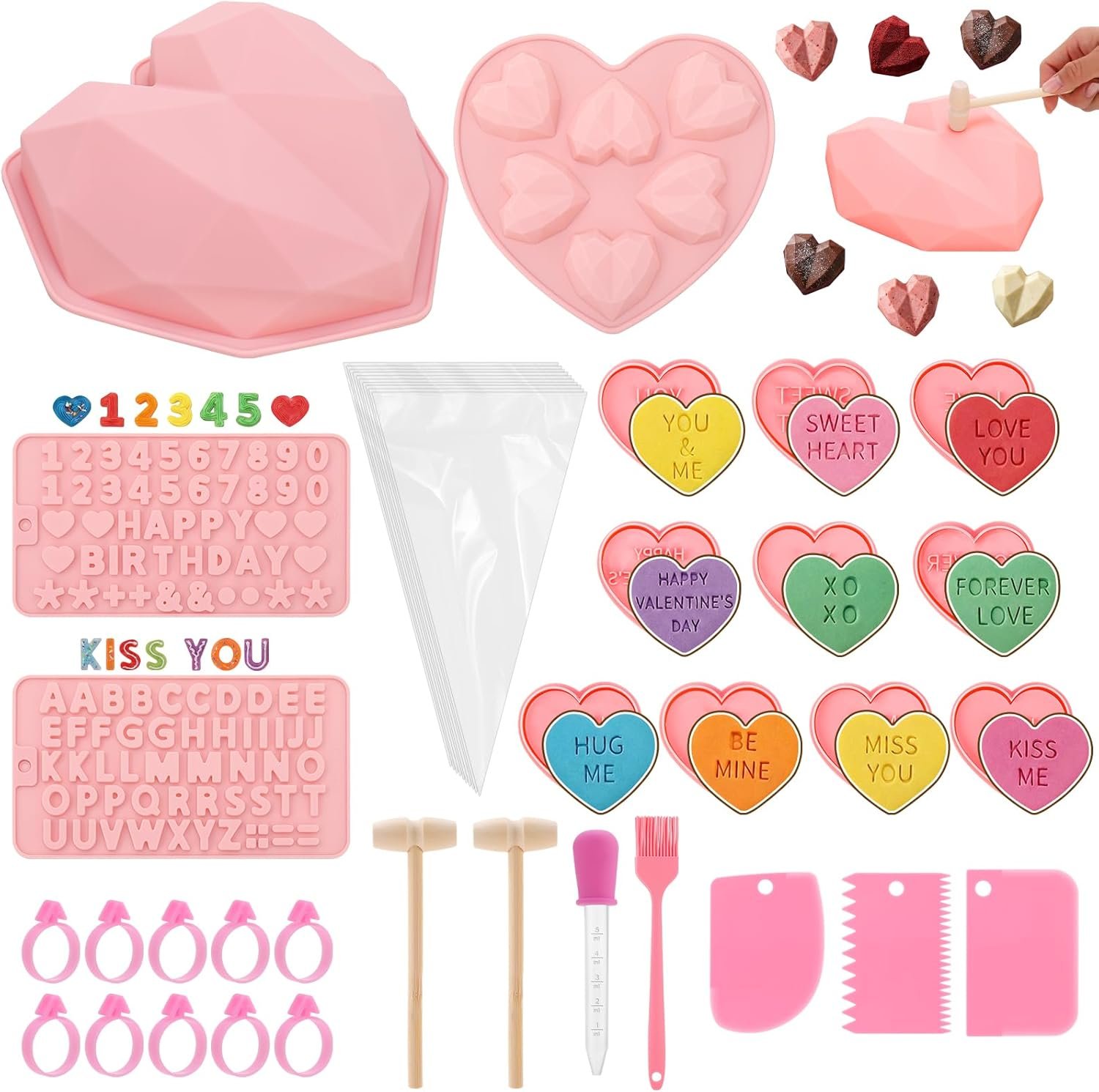 Complete Valentine Baking Kit: Chocolate molds includes 1*smashable heart molds, 1*6 3D cavities diamond heart molds,1* number molds,1* letter molds, 2* wood hammer and 3* cake scrapers, 20* cake decorative bags, 1* silicone brush, 1* droppers, 10*Heart Cookie Plastic Mold, 10 * frosting couplers