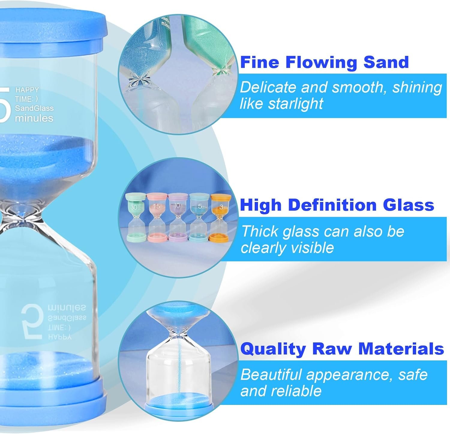 【Widely Used】This hourglass set includes various time specifications, ranging from a few minutes for short periods to half an hour for long periods. Whether it is focused training during learning, precise timing during cooking, or interactive game time between parents and children, they can all play their unique roles in improving the efficiency and quality of life and work.