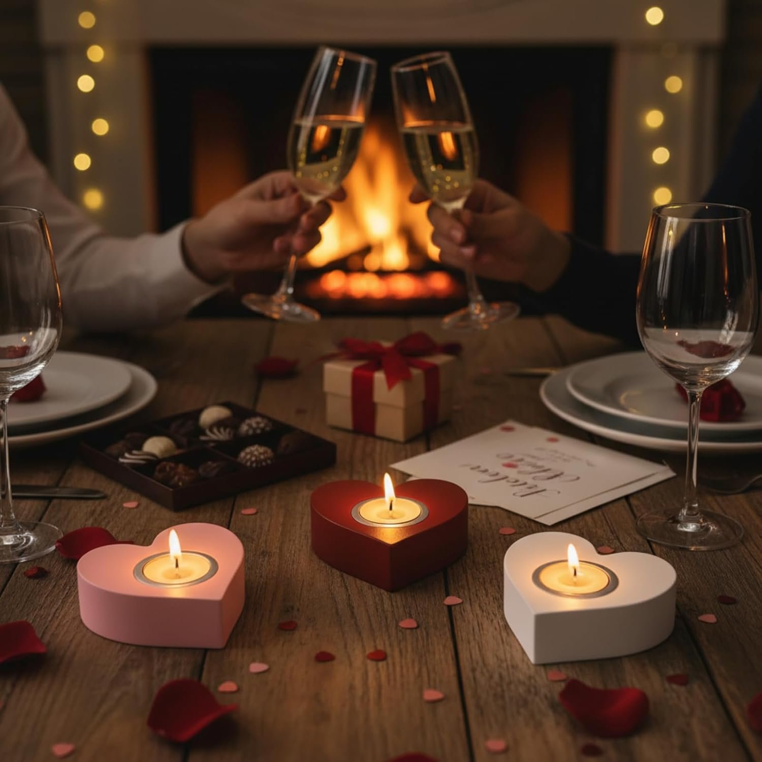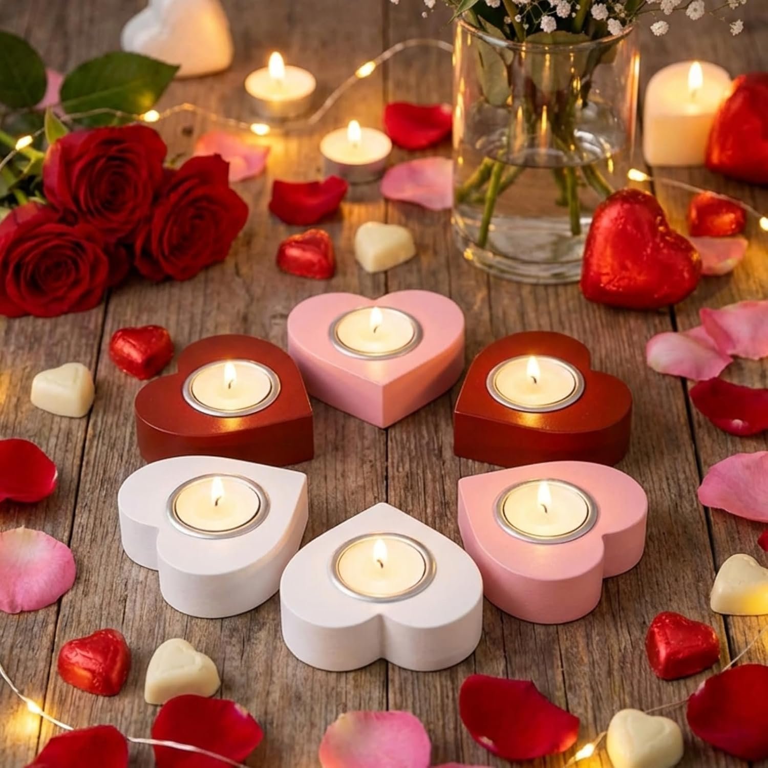 Bring warmth and rustic elegance to your celebrations with this heart taper candles holders kit of 6. Each set includes 2 red, 2 pink, and 2 white wooden candlestick holders, designed in a romantic heart shape to create a cozy and loving atmosphere.