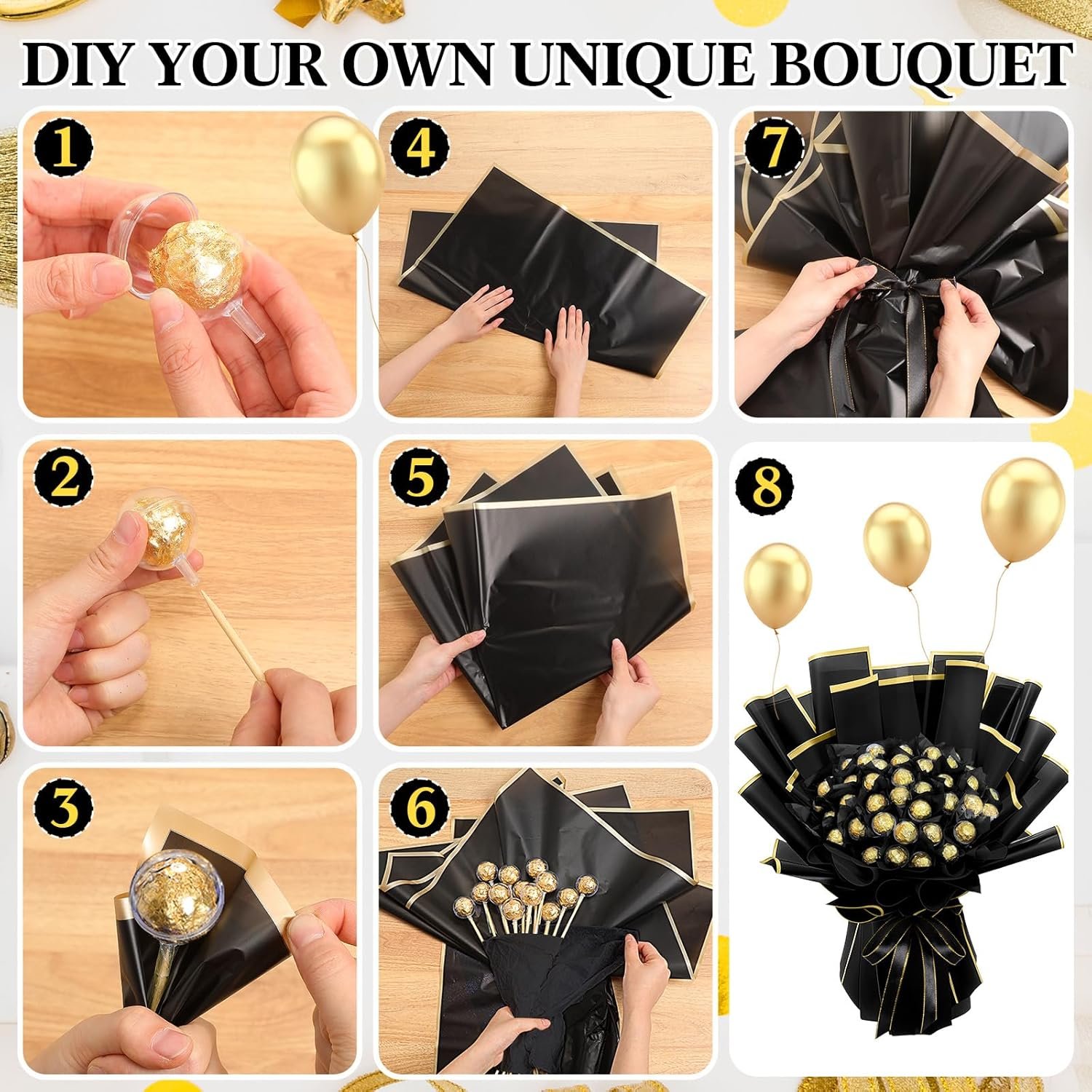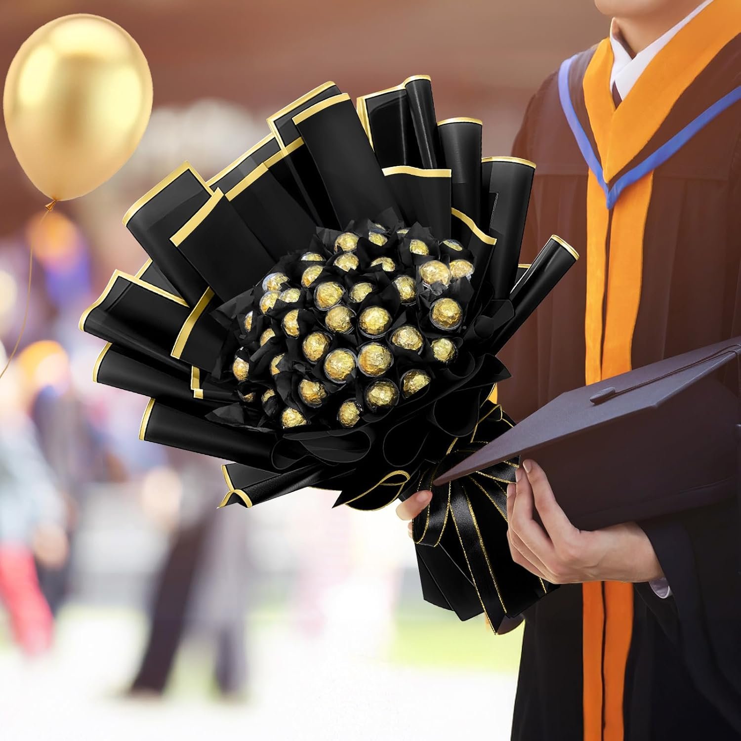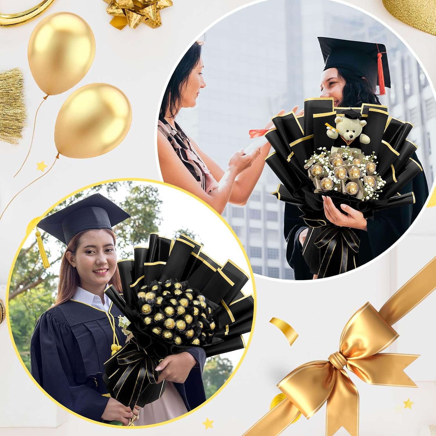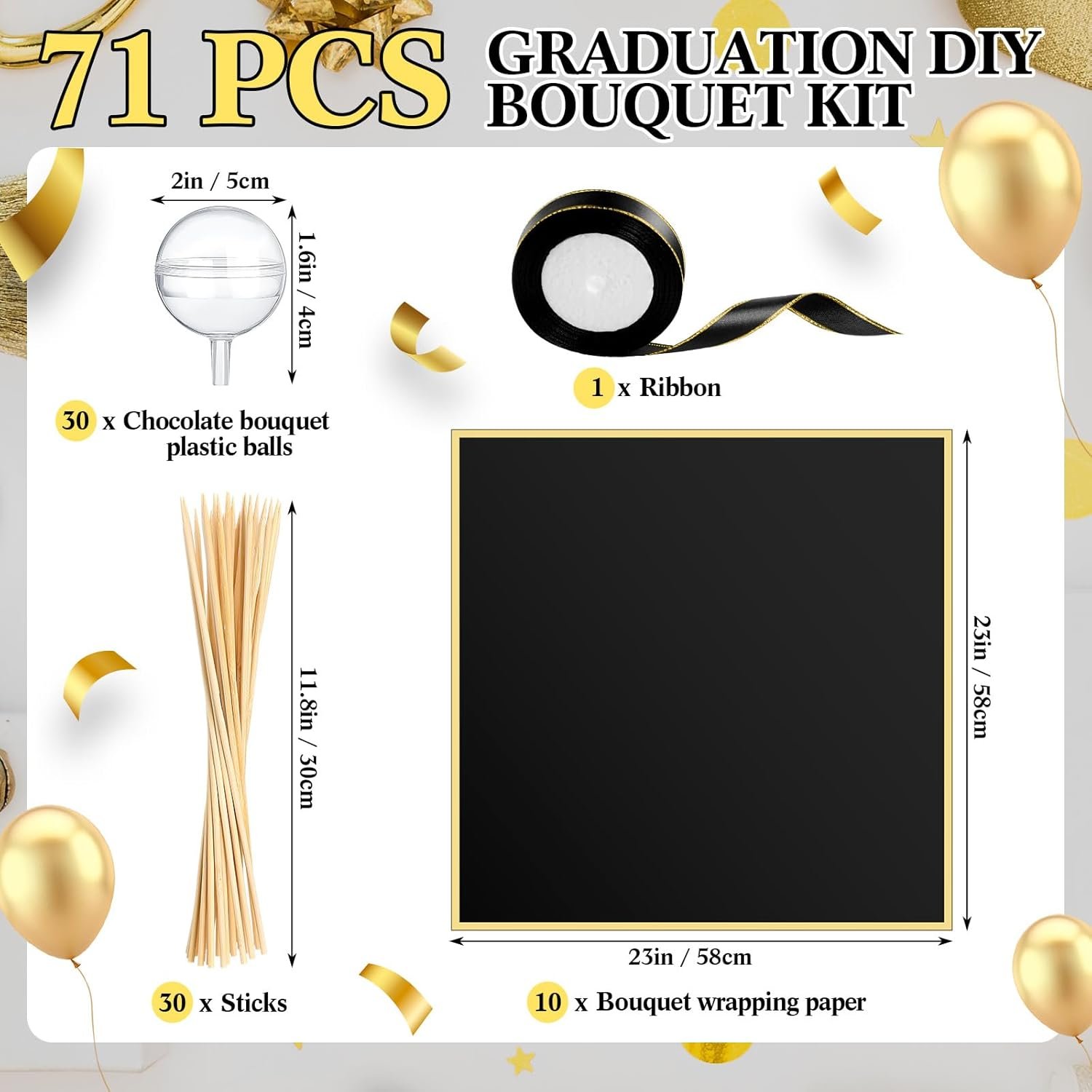 Package Contents: in this creative DIY bouquet package for graduation, you will get 30 chocolate bouquet plastic balls, 30 sticks, a roll of ribbon, and 10 sheets of bouquet wrapping paper; The combination is rich and can meet your needs for 2025 handmade DIY graduation bouquet making