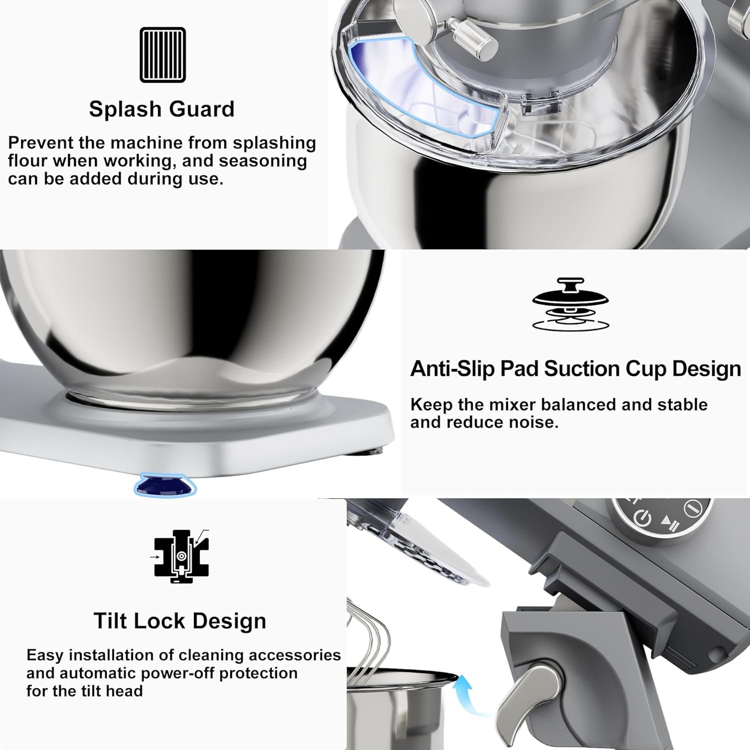 【4 Anti-Slip Suckers & Low Noise】 More powerful motor but lower operation noise.Premium stainless steel mixing bowls included with this electric mixer ensure durability and effortless cleaning, perfect for home bakers and kitchen enthusiasts seeking reliable kitchen appliances.Chassis 4 stronger suckers,can keep the machine steady and avoid moving or bounce during operation.