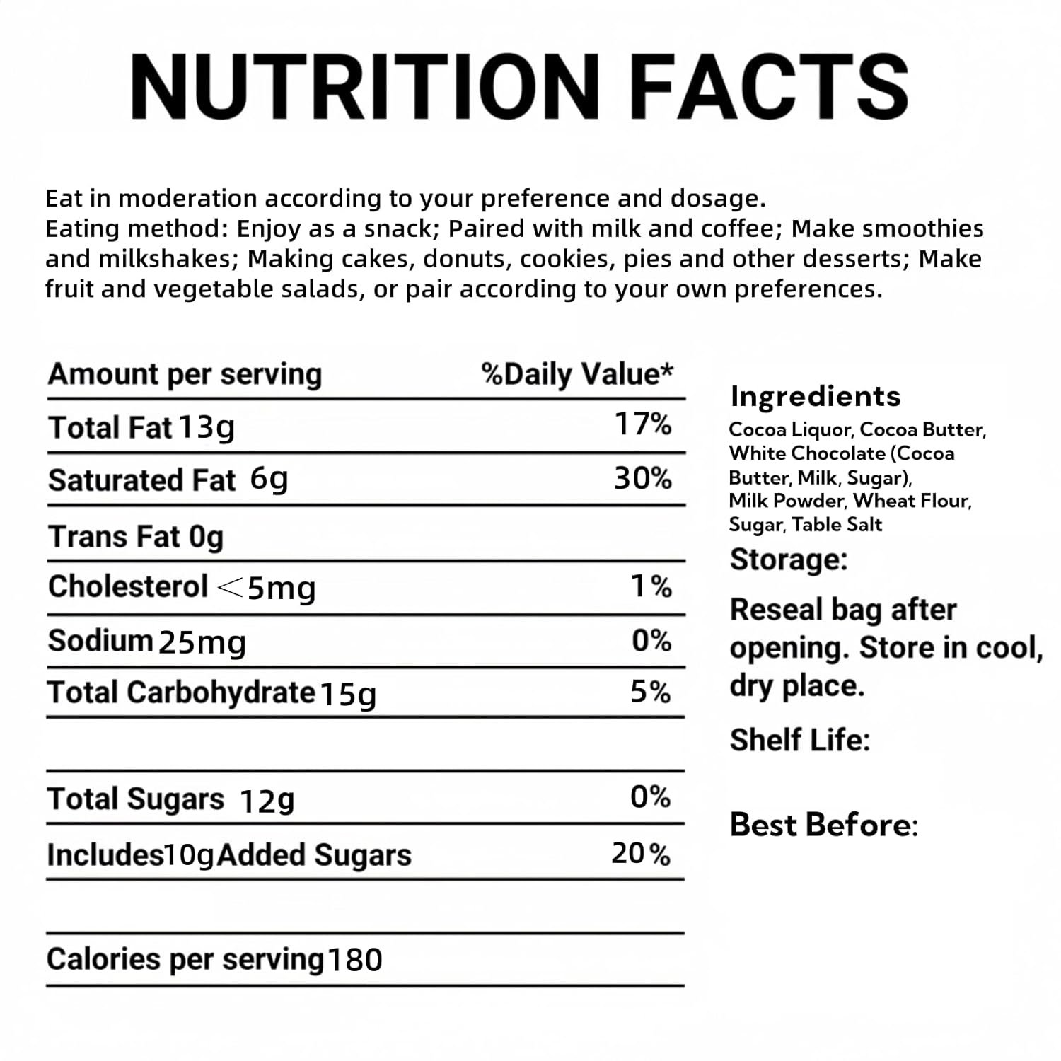 Clean & Real Ingredients – Made with real cocoa liquor, cocoa butter,white chocolate (cocoaButter, sugar).wheat flour.sugar, table salt. Our clusters feature crispy crust, with no artificial flavors or additives. sweet and salty balance