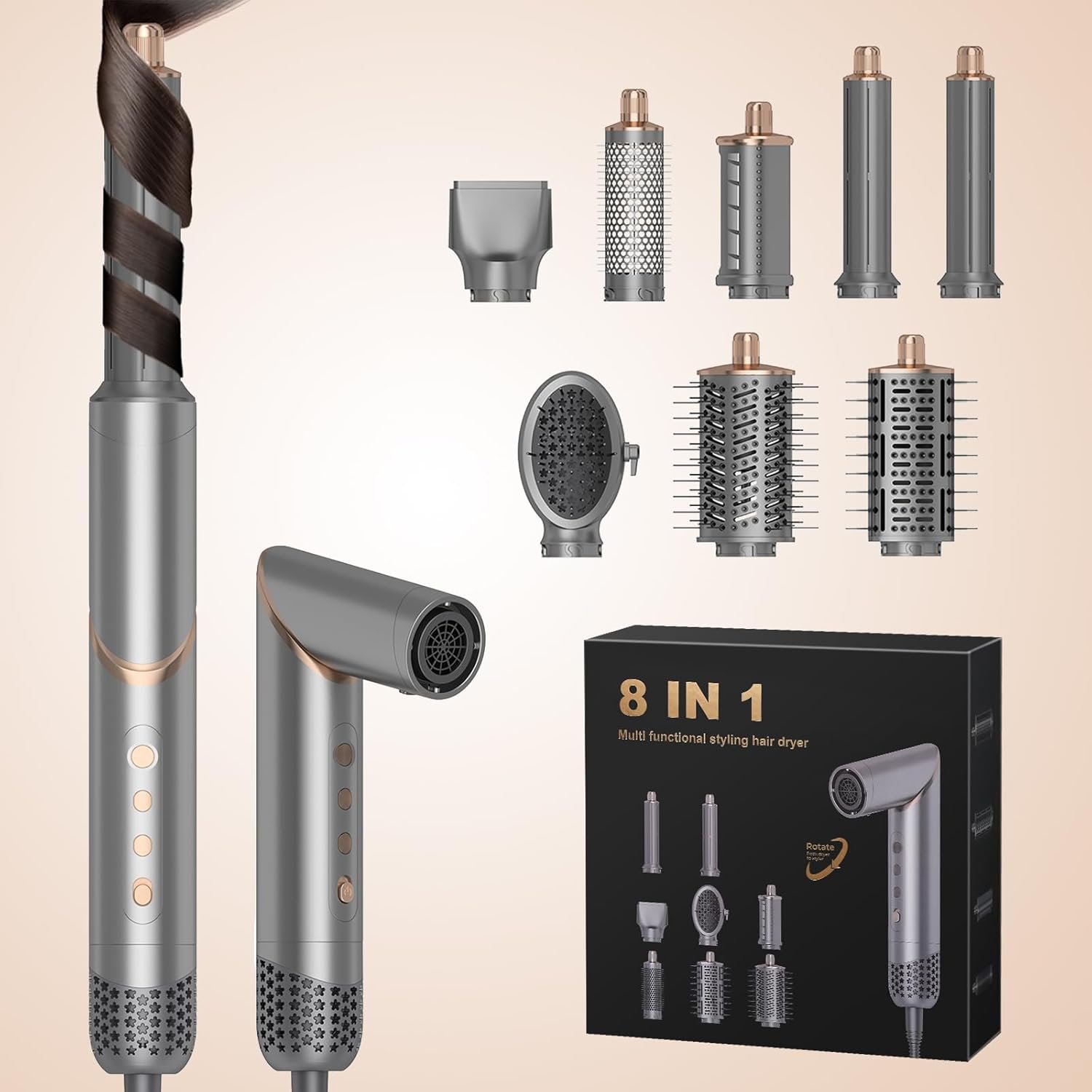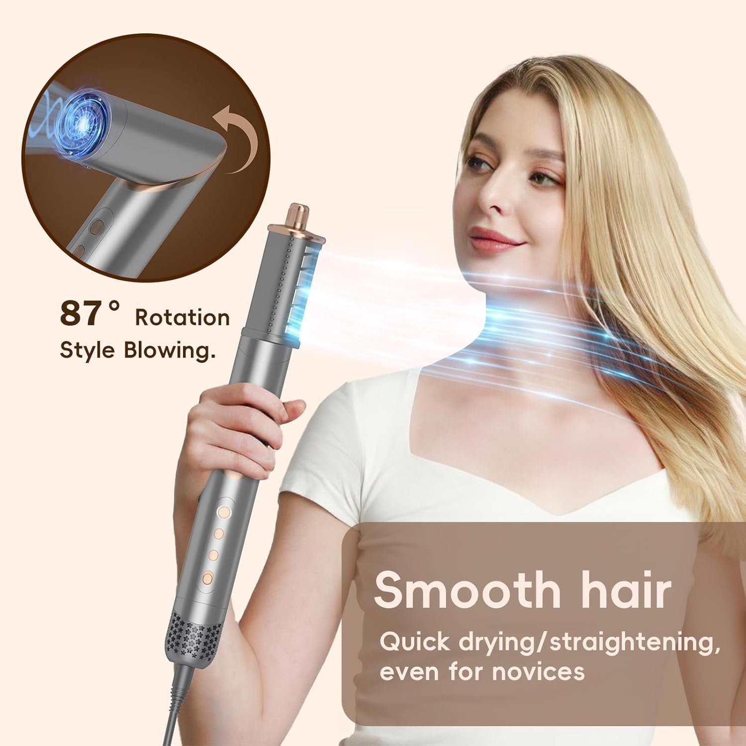 8 in 1 Rotate Hair Dryer Brush: Rotary hair dryer can be freely switched between hair dryer and styling comb.Our air hair styler set with 8 attachments: 1*hair dryer, 2*left right hair curlers, 1*smoothing comb, 1*double sided mirror comb, 1*curling comb, 2*different size inner buckle comb, and a pair of anti-scald gloves. Locking button can easily switch between attachments and fasten attachments securely