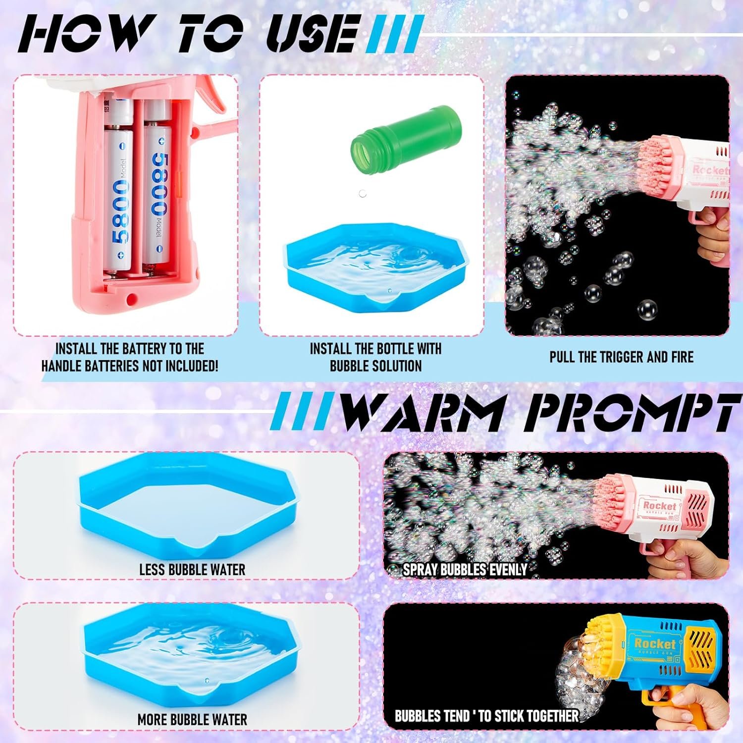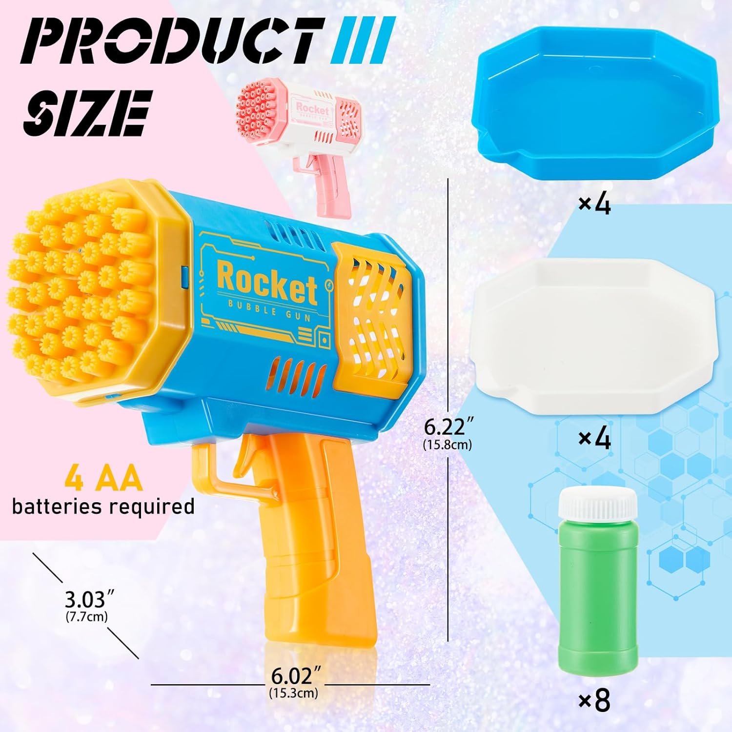Value Set: includes 4 yellow and blue bubble guns, 4 pink bubble guns, and 8 bottles of bubble solution; Our bubble guns are suit for group games, Please note: package does not include batteries; It requires 4 AA batteries; The product’s foaming efficiency is affected by the installed battery current; Please choose high-capacity AA batteries; If there are few bubbles and the nozzles are clogged, please replace the batteries or use batteries from other reputable brands
