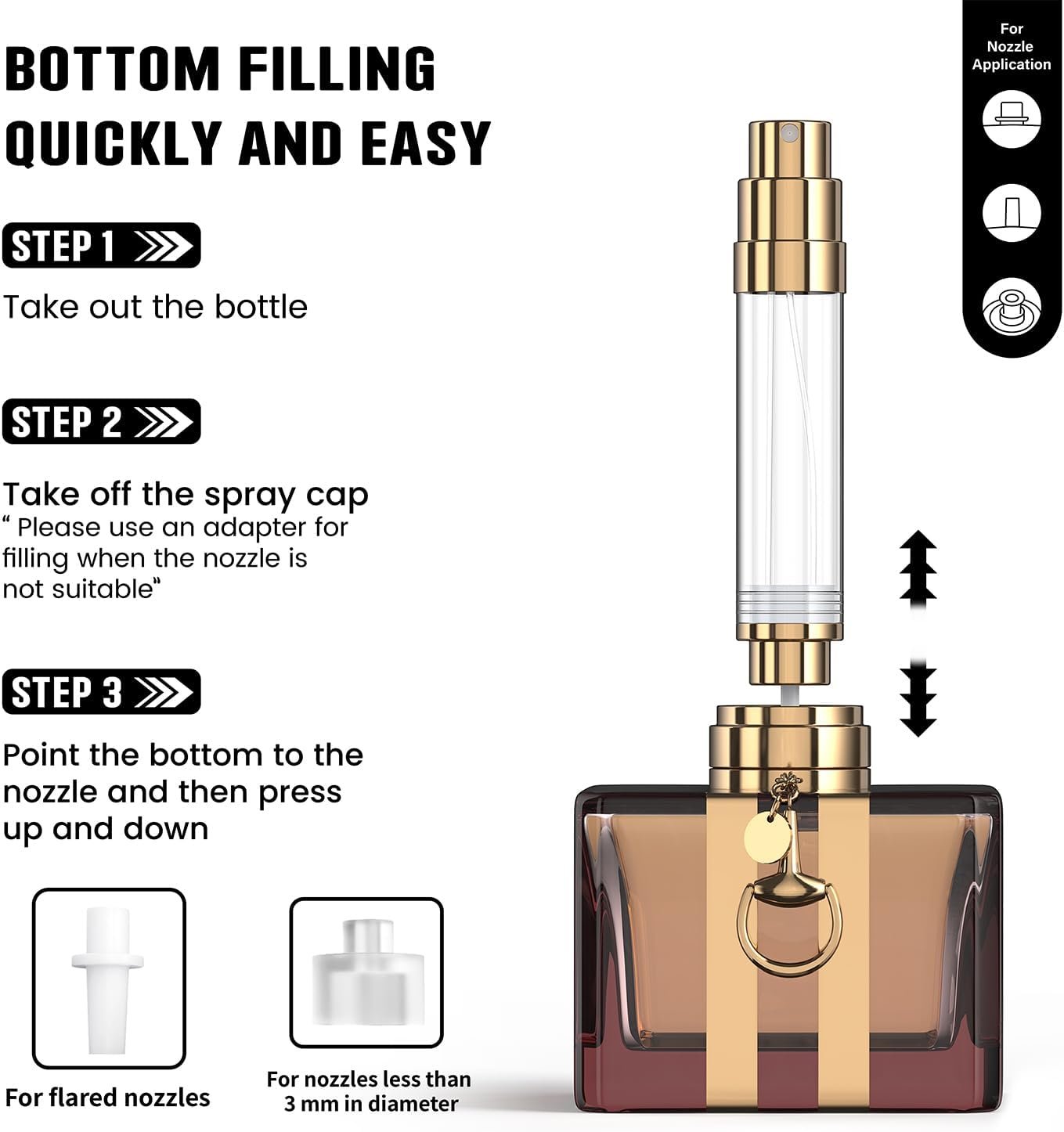 Quick & Easy to fill: Simply press the bottom valve and use included adapters to fill cologne travel bottle in seconds – no funnels or mess, so you can quickly transfer your favorite fragrances on the go