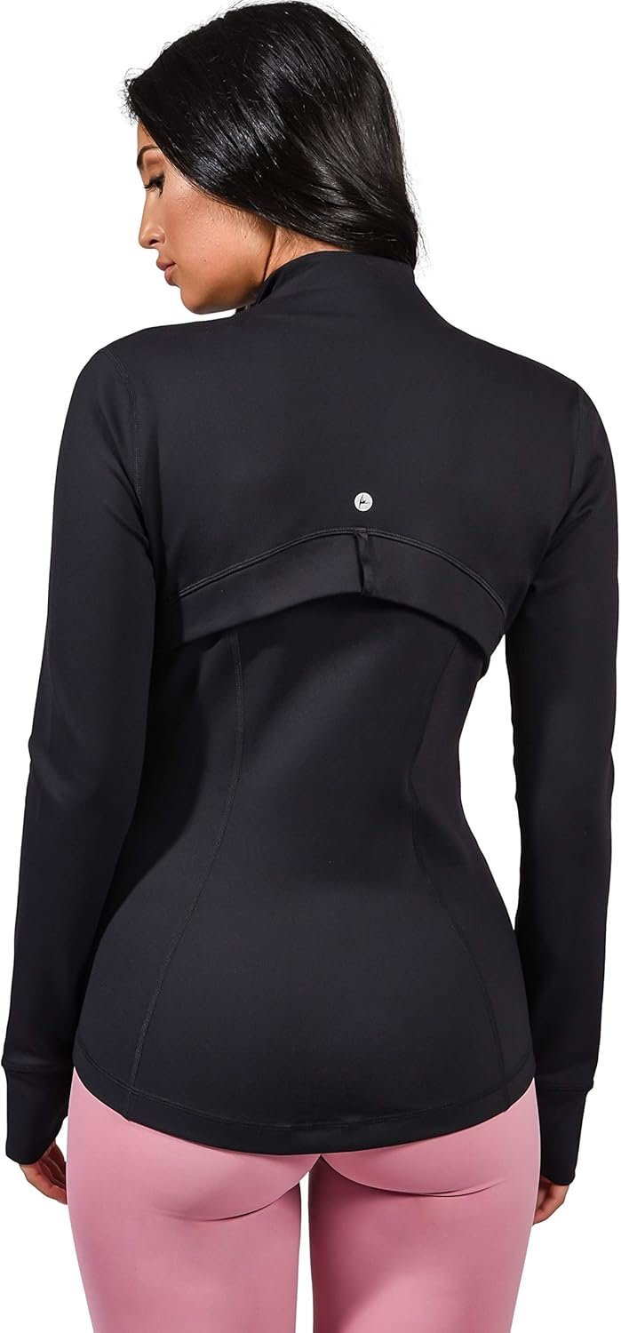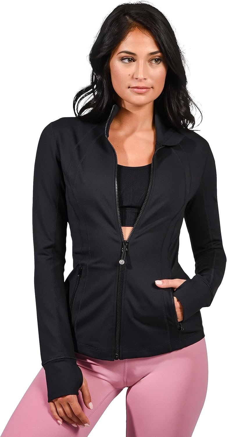 Customers find the running jacket has a slimming fit and is comfortable in any temperature, with sturdy midweight fabric and a flattering cut that highlights their curves. The jacket receives positive feedback for its quality and style, with one customer noting it looks and feels expensive. Regarding size, while some find it true to size, others mention it runs small. The zipper quality receives mixed reviews – while some say it works seamlessly, others report issues with it catching on the sleeves.