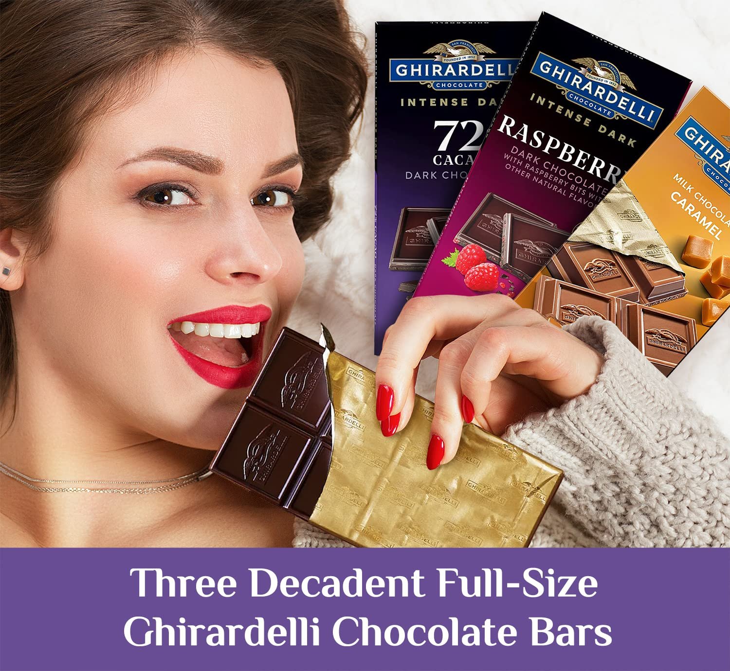 Discover our collection of three full-size Ghirardelli Chocolate Bars, including a Milk Chocolate Caramel Filled Bar, an Intense Dark 72% Cacao Dark Chocolate Bar, and an Intense Dark Raspberry Dark Chocolate Bar. These Ghirardelli chocolate candy bars break apart easily into individual squares for the perfect appetizer or after dinner dessert.