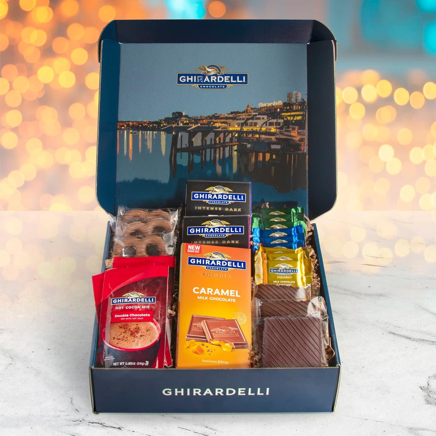 Send a Ghirardelli themed gift box to a family or an office! An assortment of best selling Ghirardelli chocolate bars, tasting squares, and “Made with Ghirardelli” chocolate covered pretzels and graham crackers – packed in a Ghirardelli themed gift box that impress any crowd. 3 lbs.