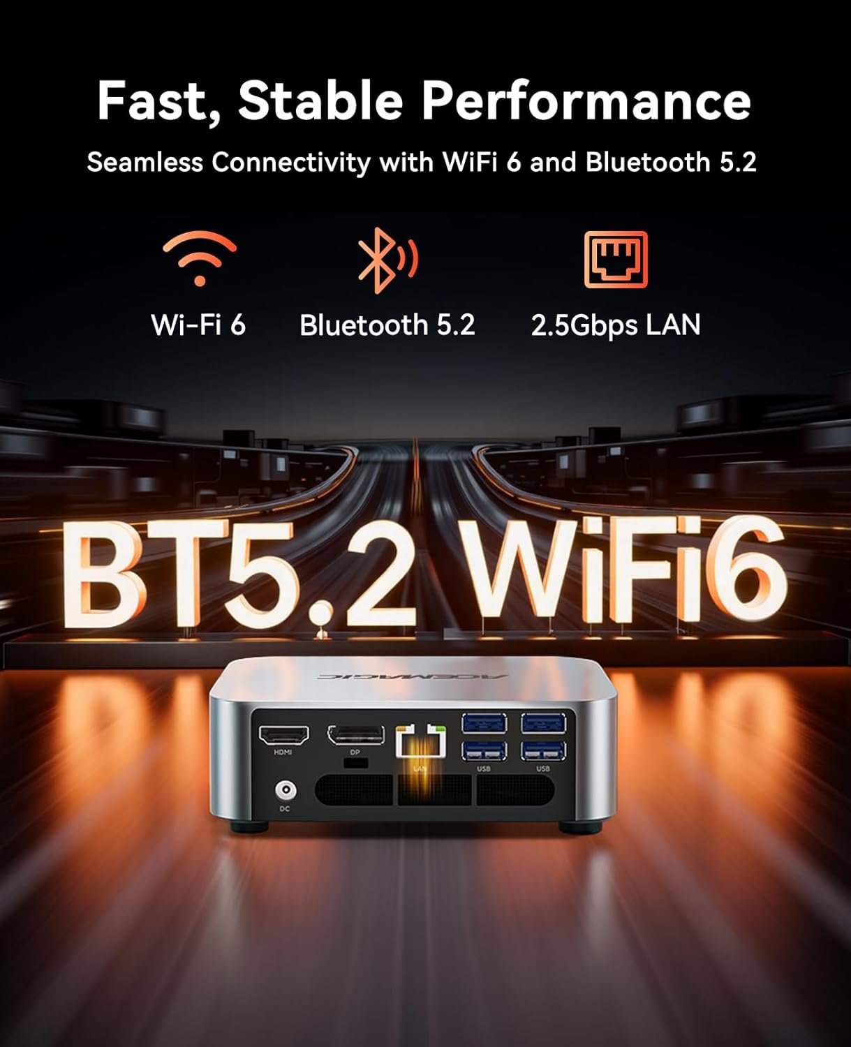 【Versatile 5xUSB3.2 Ports & High-Speed Network】Featuring 5×USB3.2 and a Gen 2 Type-C port with up to 10Gbps transfer speed, this mini PC lets you move large files in seconds for higher productivity. The Type-C port also supports DP1.4 (4K@60Hz) display output and PD charging. With a 2.5G RJ45 port delivering blazing-fast 2500Mbps wired speeds, plus WiFi 6 and Bluetooth 5.2 for strong, stable, and seamless wireless connections, you’ll enjoy smooth work and entertainment without lag.