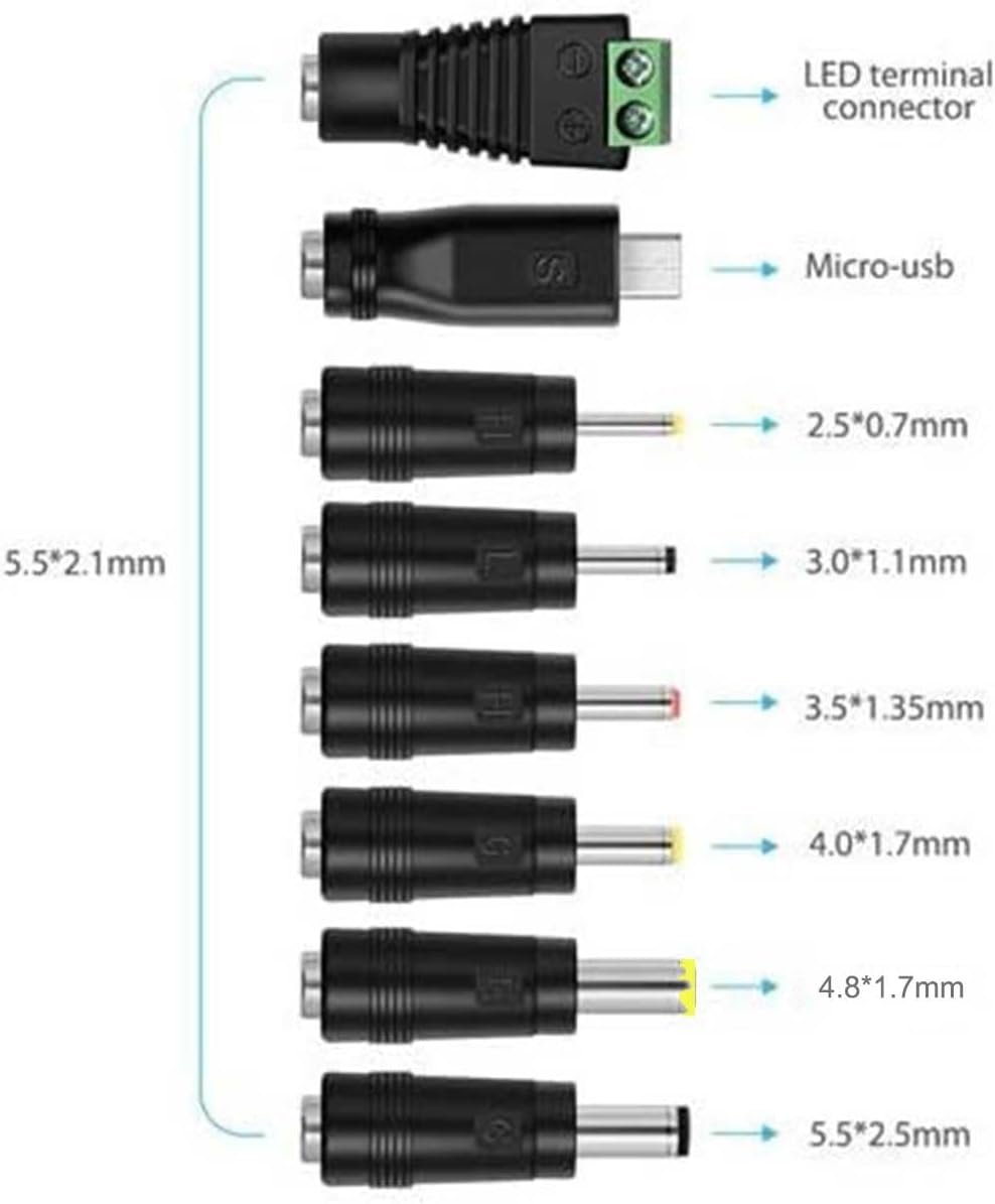 CONNECTOR OPTIONS: Features multiple connector tips including 2.5×0.7mm, 3.0×1.1mm, 3.5×1.35mm, 4.0×1.7mm, 4.8×1.7mm, and 5.5×2.1mm (Compatible With 5.5*2.5mm)