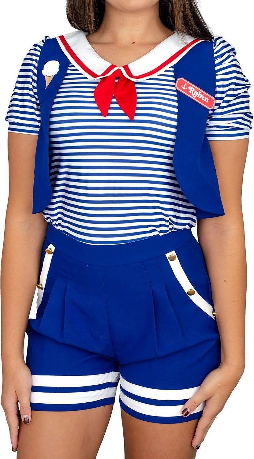 Fans of the ST streaming show will love this screen accurate show Robin character costume; includes everything you need to transform into everyone’s favorite Scoop’s employee. fight evil at the mall in style this Halloween season when you dress to impress all your fellow fans at your next Halloween costume party or at comic con where all your fellow fans gather to celebrate. A Scoop’s employee can save the day from anything that might pop up, so if you are feeling heroic and want to dazzle all your friends, this ST show Robin costume is exactly what you’re want to wear this season.