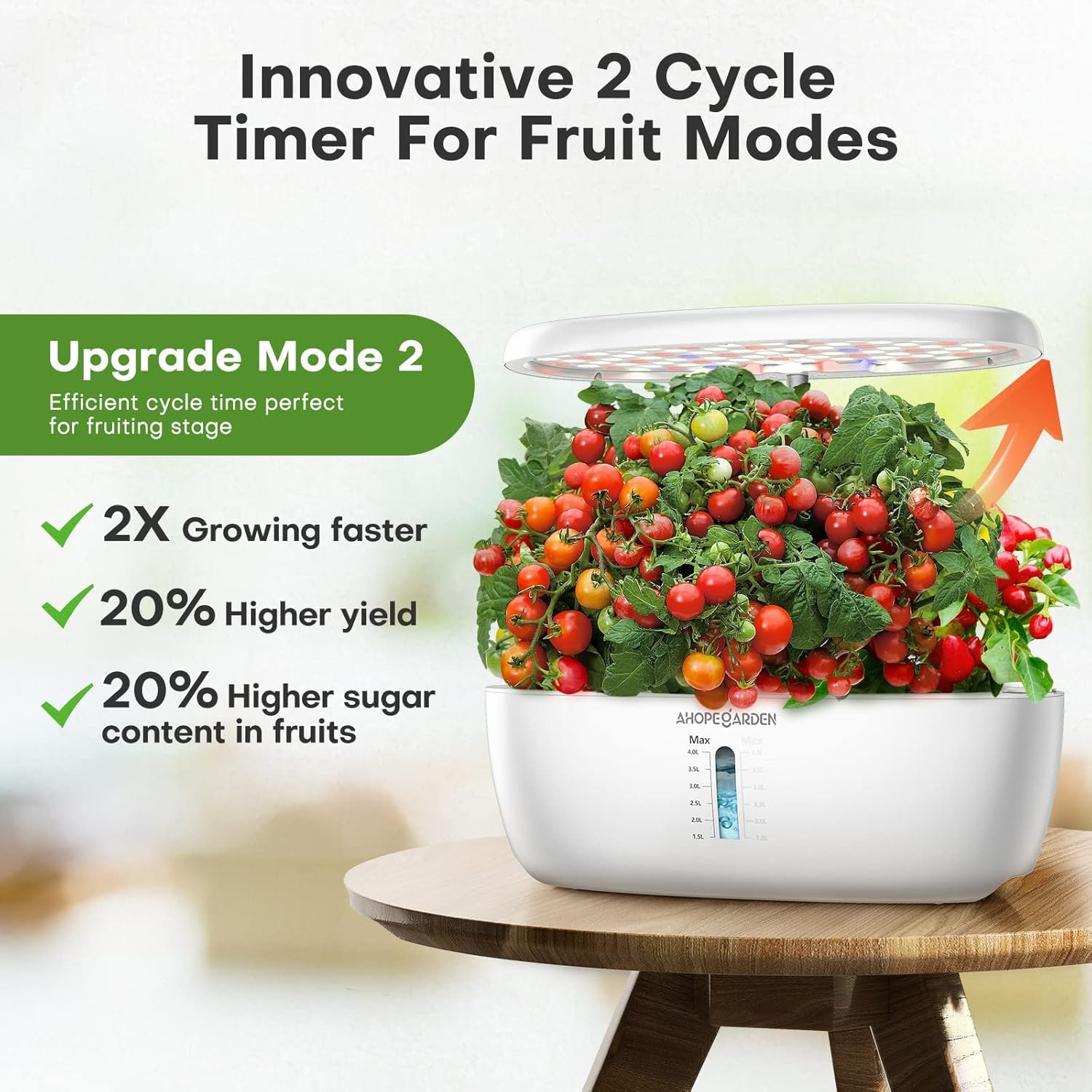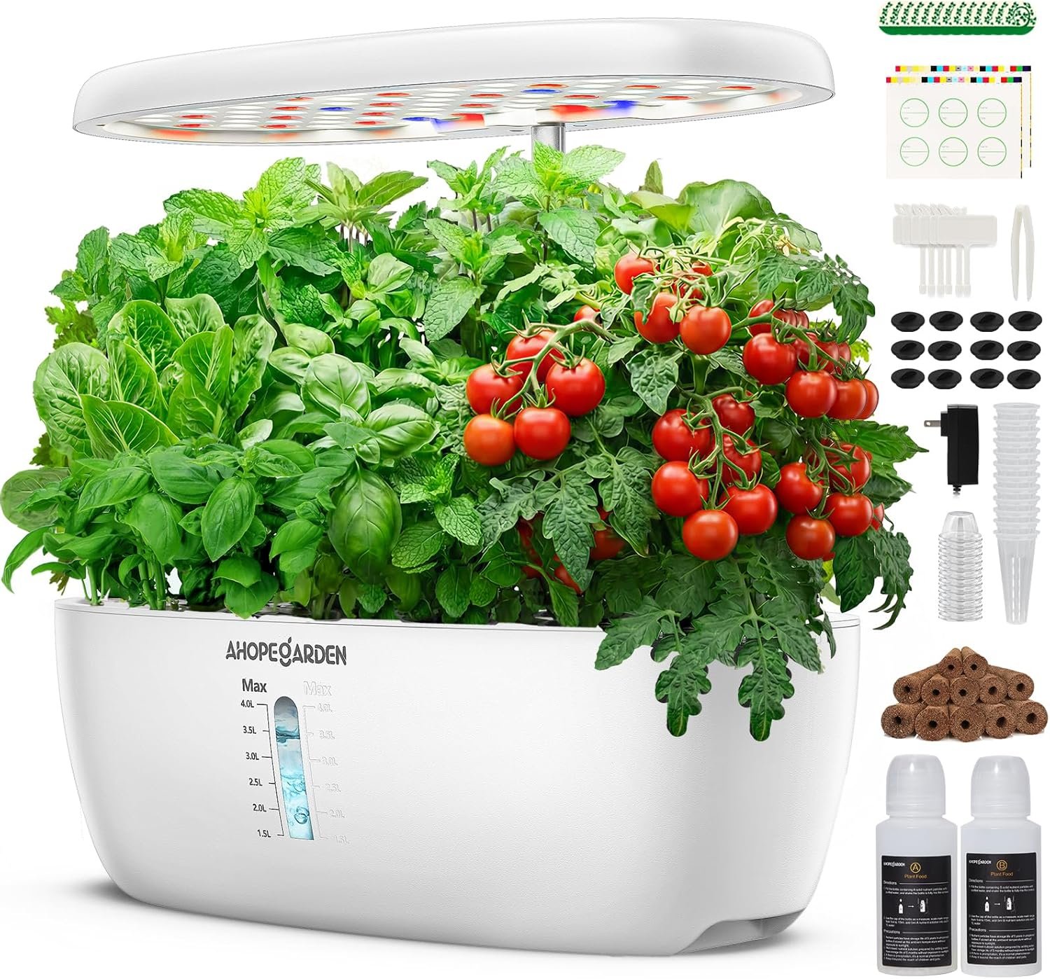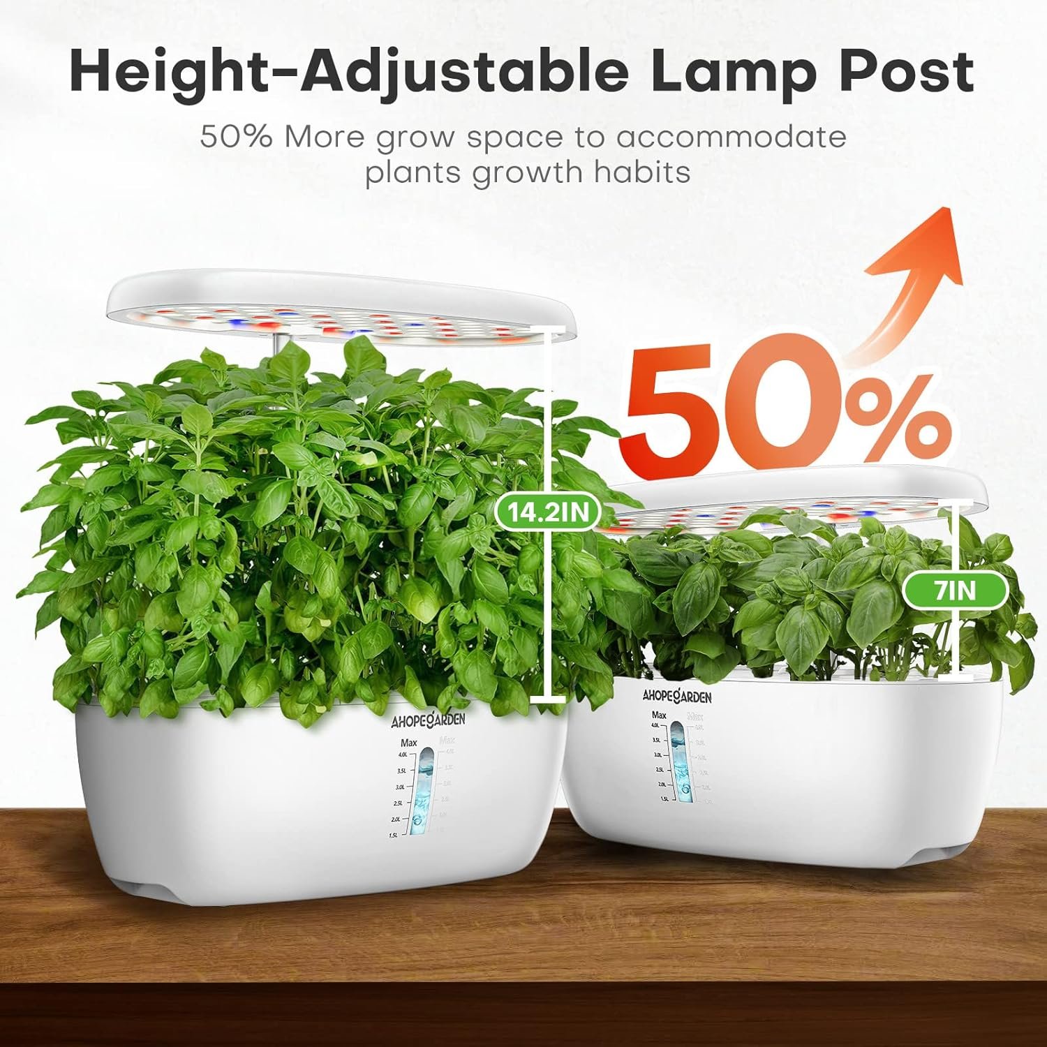 Ideal Growing Conditions:Our hydroponics growing system comes with a height-adjustable light post that can be raised up to 14.2″,providing 20% more illumination area and allowing plants at different growth stages to thrive.With a spacious 4L tank,your plants will have plenty of room to spread their roots – a must-have feature for any hydroponics system.This indoor garden kit is designed to accommodate plants of all sizes and growth habits, ensuring they receive the best possible care.