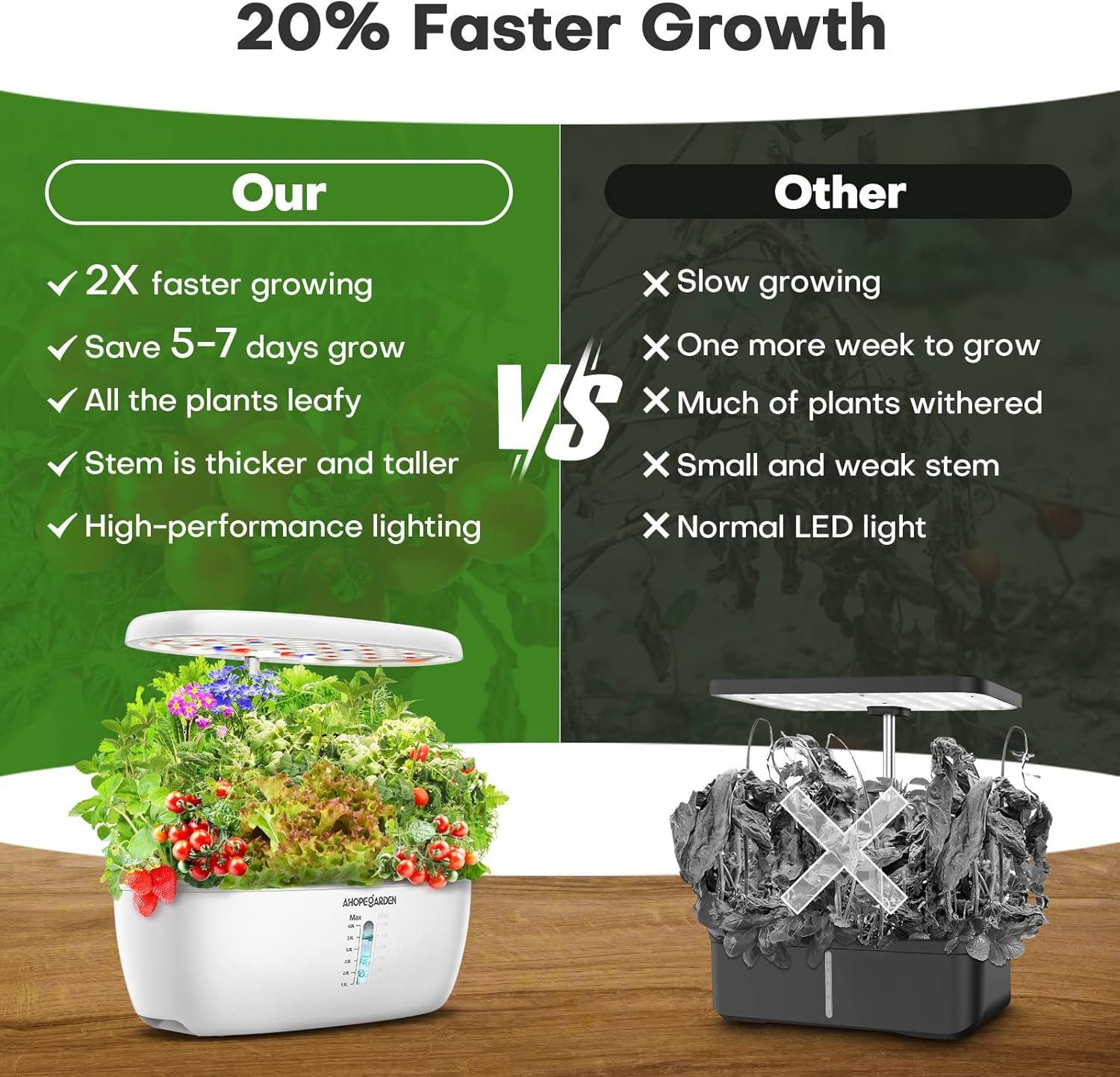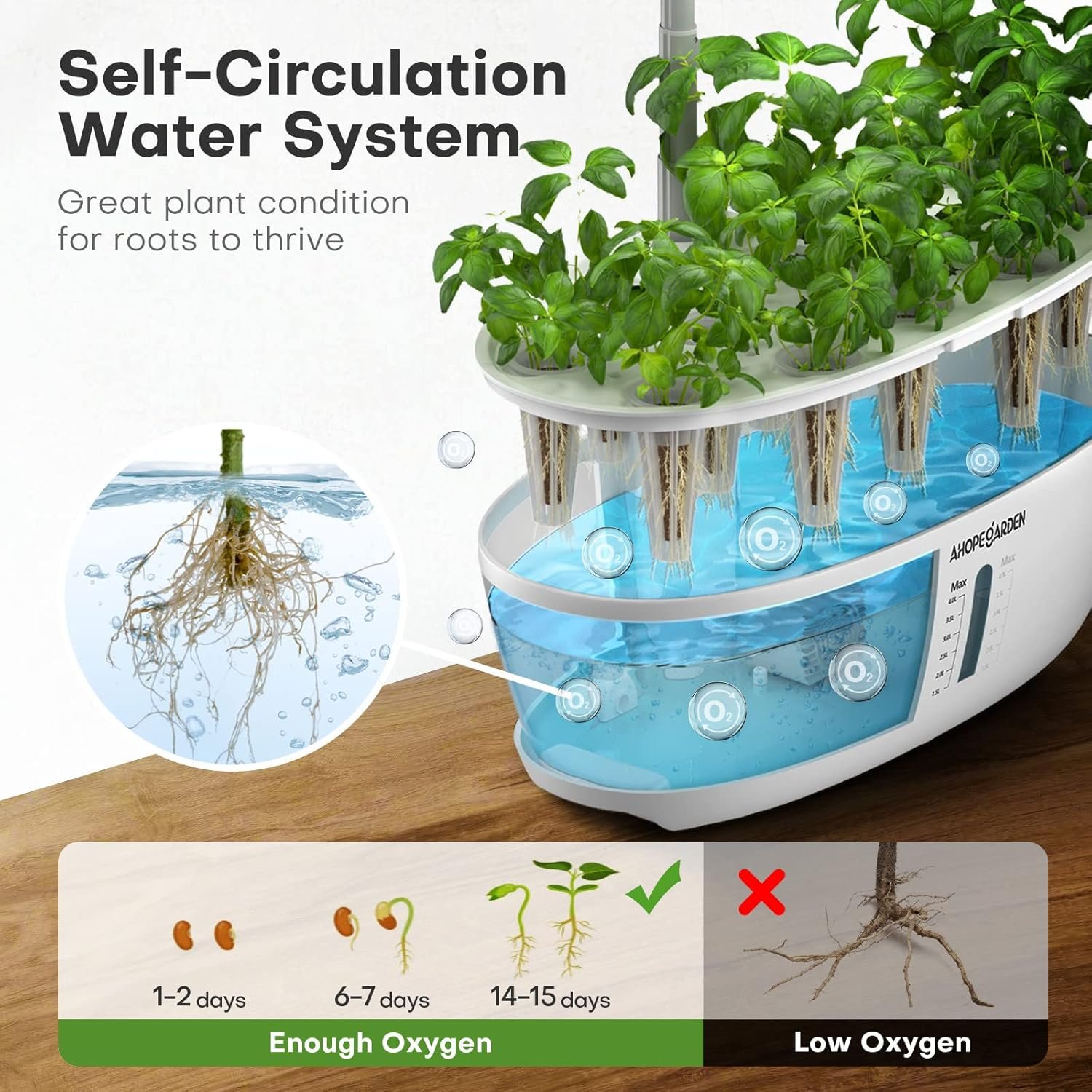 Effortless Self-Circulation System:Our hydroponic growing system features a silent pump that helps circulate water, increase oxygen, and efficiently distribute nutrients to the roots,helps plants grow 3x faster than in soil.The indoor herb garden pump operates on a 30-minute on-and-off cycle,keeping the water fresh and maximizing energy savings.Also,large tank supports plants for 2-3 weeks in the growth period without frequent maintenance.Enjoy an easy harvest of fresh fruits and herbs!