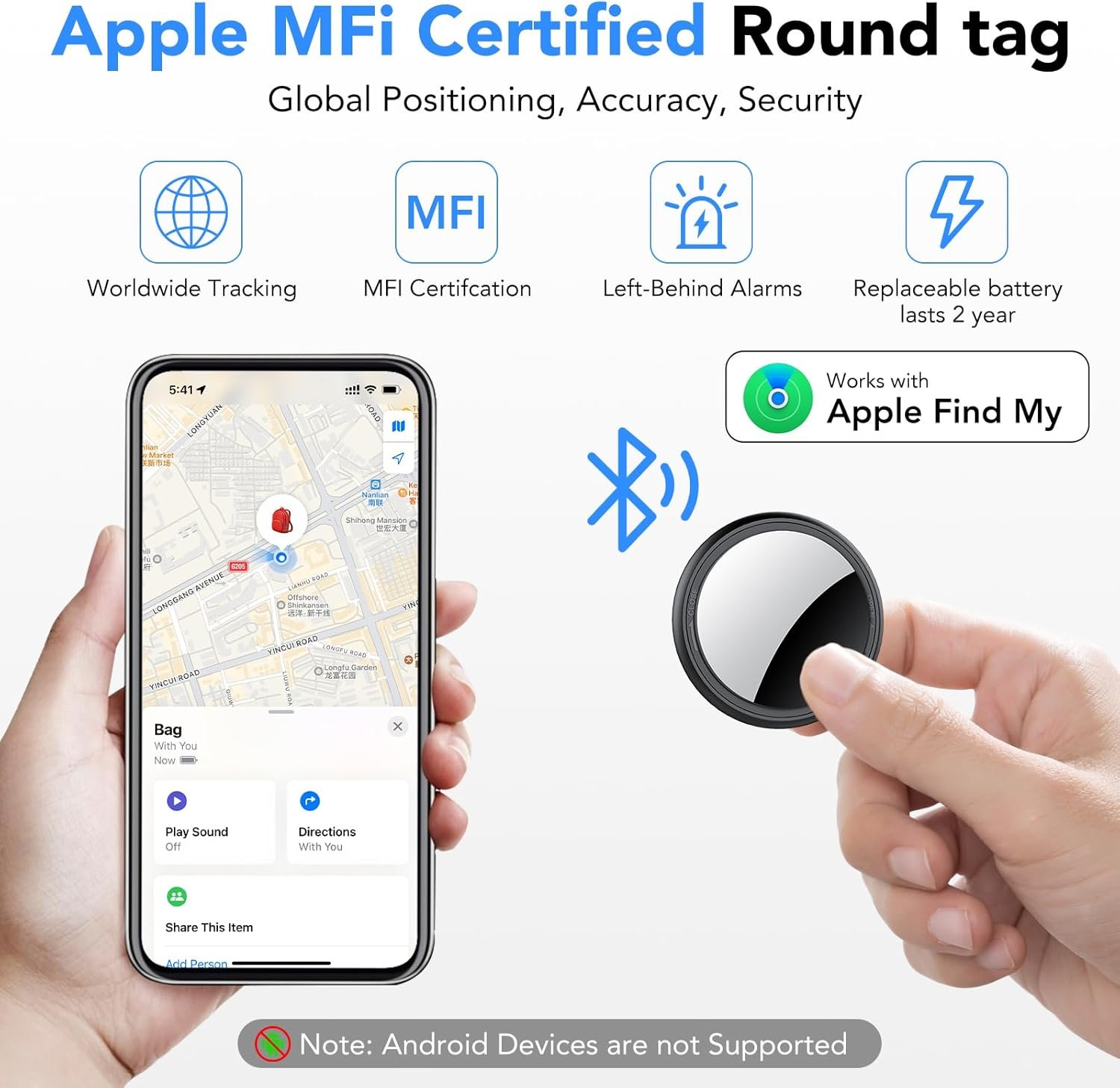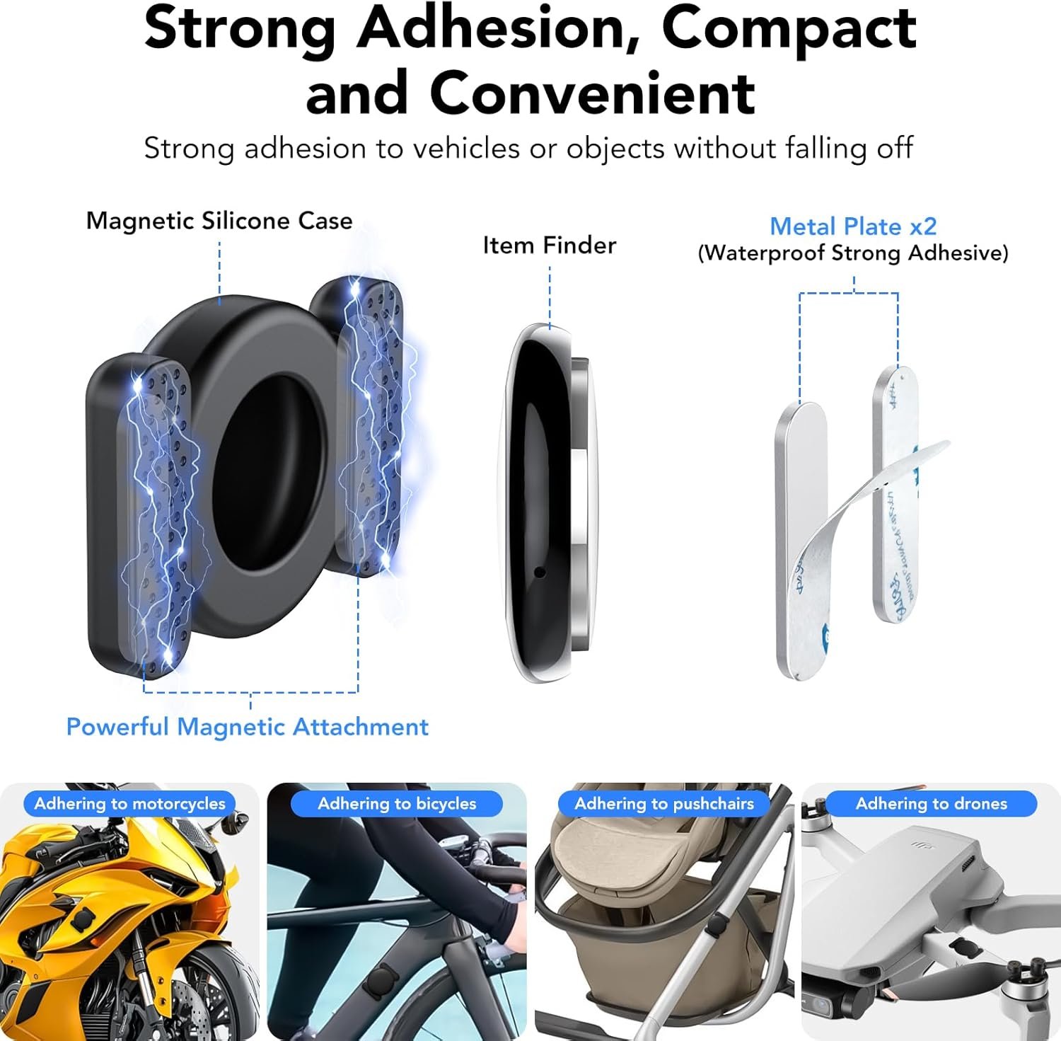 【Package Contents】4 × Round Tag (1.2 × 0.3 inches, 0.3 oz), 4 × 𝙋𝙧𝙤𝙩𝙚𝙘𝙩𝙞𝙫𝙚 𝙎𝙞𝙡𝙞𝙘𝙤𝙣𝙚 𝘾𝙖𝙨𝙚 (2x round + 1x Neck collar + 1x magnetic pair of adhesive strips), 2 × 𝙆𝙚𝙮 𝙍𝙞𝙣𝙜, 1 × User Manual. Stick it, hang it, or attach it magnetically—works with keys, backpacks, luggage, collars, bicycles, and all your everyday items. (Compatible only with iPhone/iPad (iOS 14.5+) devices. Not compatible with Android devices.)