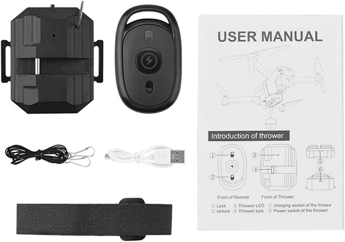1x Thrower, 1x remote control, 2x Sling cable, 1x cable tie, 1x Thrower charging cable