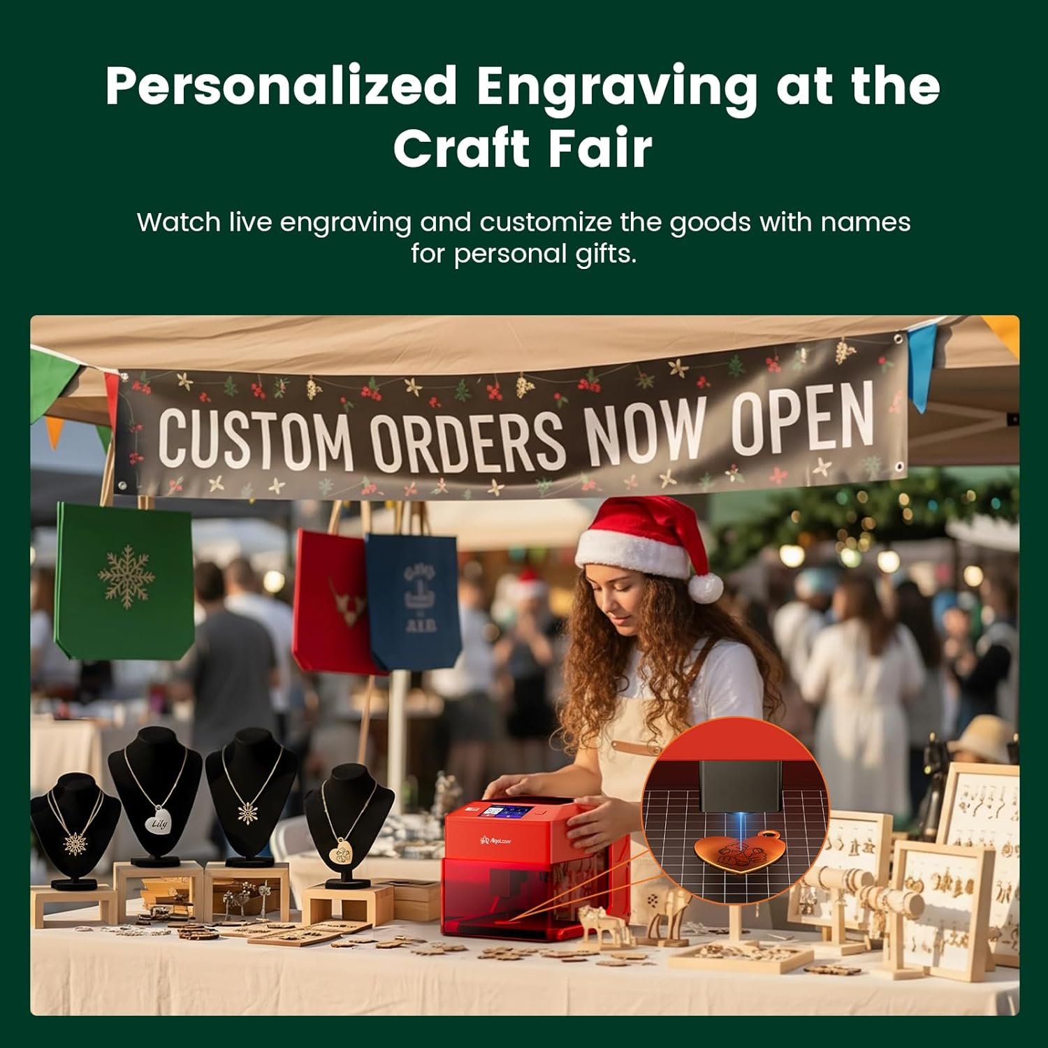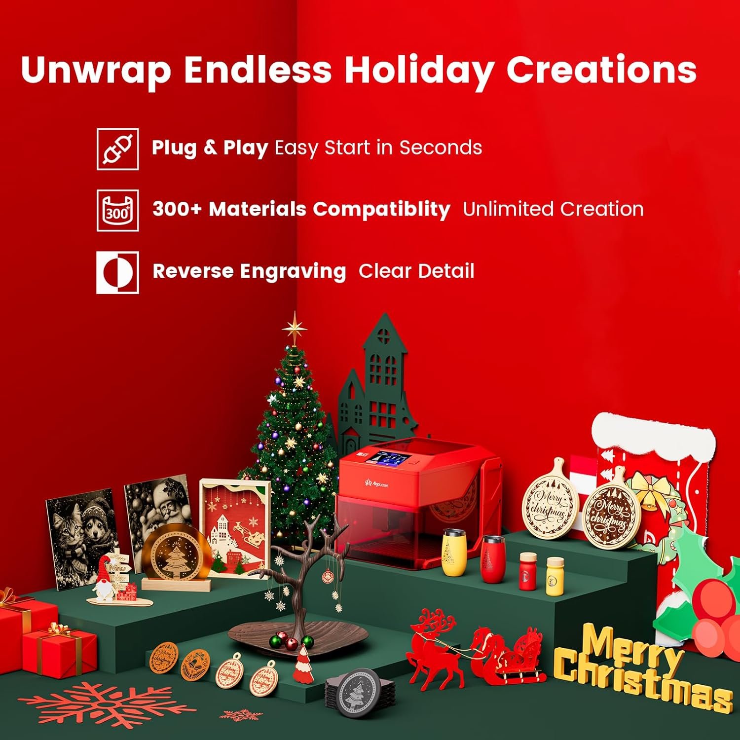 The video showcases the product in use.The video guides you through product setup.The video compares multiple products.The video shows the product being unpacked. Create the Perfect Christmas Gifts with AlgoLaser Merchant Video