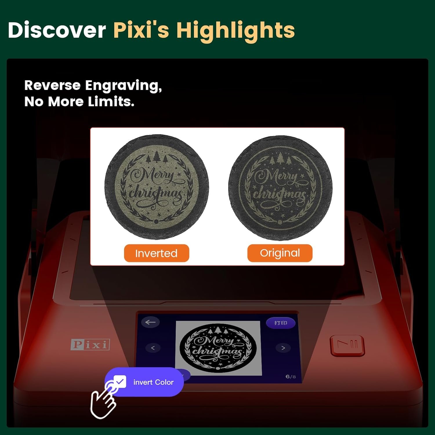 【Unleash Your Creativity with Laser Engraver】 Anywhere/Anytime Pixi patented AlgoSketch captures hand-drawn artwork, while AlgoType produces crisp, professional text. With simple 3-step operation—drag, place, engrave—laser engraving has never been easier, even for beginners. Reverse Engraving delivers high-contrast results on acrylic, glass, wood, and leather (colored backers recommended for transparent materials).