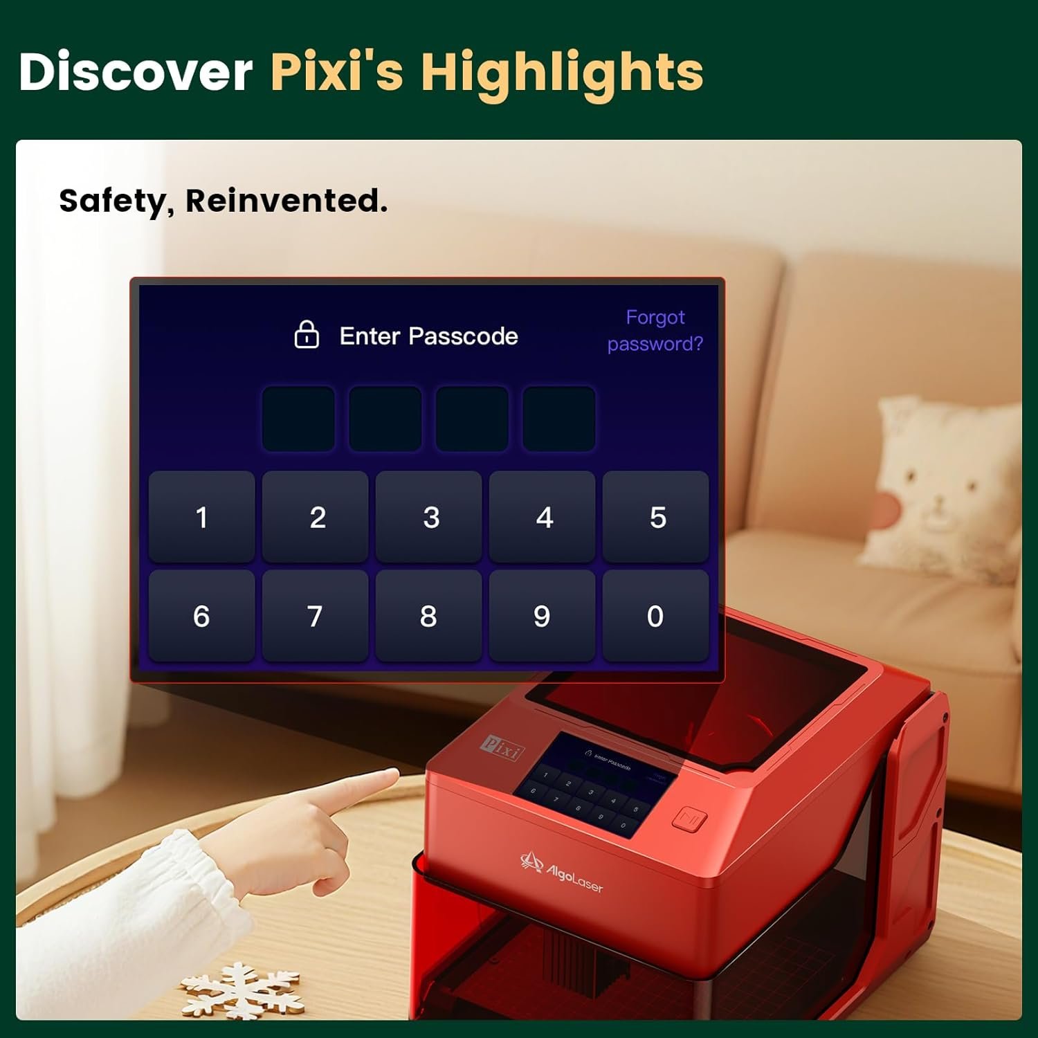 【Built-In Safety and Professional Quality】 The Pixi Laser Engraver Machine is built for both professional precision and user safety. Its auto-pause safety door automatically stops the laser the instant the lid is lifted, preventing accidental exposure. The machine will not resume until the lid is securely closed, ensuring full protection during operation. A certified Class 1 laser system, password-protected lock screen, and real-time fault alerts add multiple safety layers.