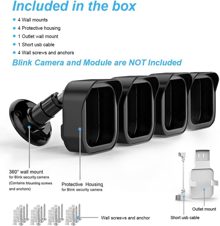 【What’s in the Package】Each pack comes with 4 plastic weatherproof housings, 4 Blink Camera Mounts, 1 Outlet Mount for Blink Sync Module 2, necessary screws and anchors. (The camera and module are NOT included.)