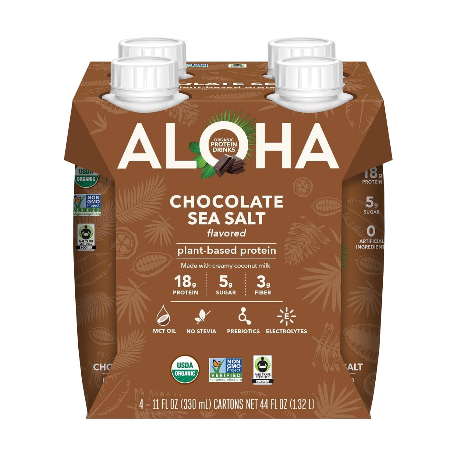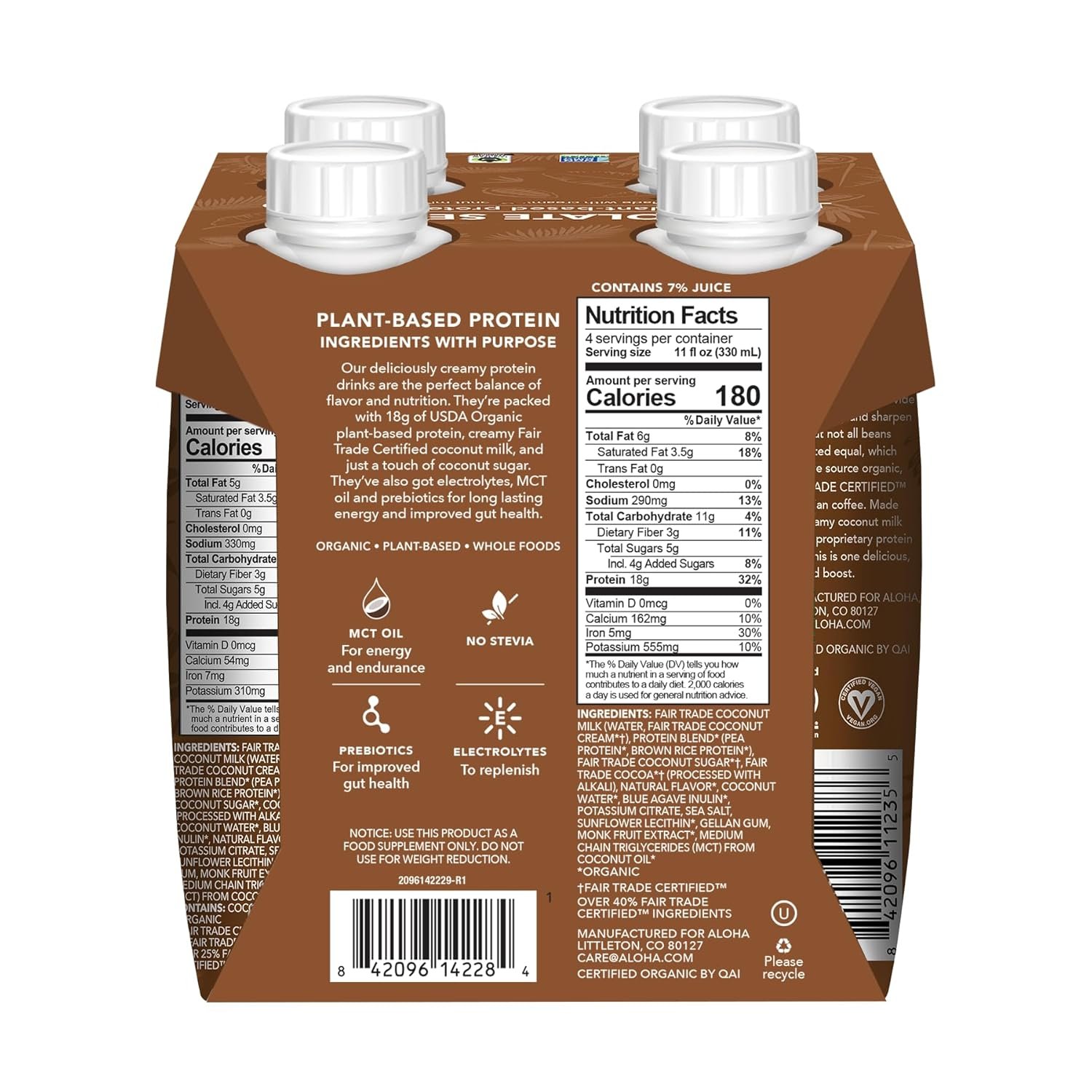 Fuel your day with clean, organic energy from ALOHA Chocolate Sea Salt Plant-Based Protein Drinks, a delicious, ready-to-drink protein shake made with creamy organic coconut milk. Each 11 fl oz Tetra Pak delivers 18g of plant-based protein, 5g of sugar, and 3g of fiber, offering a smooth, naturally sweet taste without the chalkiness or artificial aftertaste found in many protein drinks. ALOHA’s organic protein blend combines Fair Trade Certified pea protein and brown rice protein for a complete amino acid profile that supports muscle recovery and sustained energy. MCT oil from coconut provides a clean source of endurance fuel, while prebiotics from organic blue agave inulin help promote gut health and digestion. Plus, electrolytes from coconut water help you stay hydrated and refreshed, before or after your workout, between meals, or anytime you need a plant-powered pick-me-up. Made with all-organic, Non-GMO ingredients and absolutely no stevia, soy, or artificial additives, this vegan protein shake is crafted to support your healthy lifestyle while tasting incredible. Whether you’re plant-based, dairy-free, or simply looking for a nutritious on-the-go snack, ALOHA’s Chocolate Sea Salt Protein Drink delivers everything you need, clean protein, balanced nutrition, and crave-worthy flavor. Certified USDA Organic, Non-GMO Project Verified, Vegan, Gluten-Free, and Fair Trade Certified, ALOHA’s plant-based protein drinks are as good for the planet as they are for your body. Packaged in recyclable Tetra Pak cartons for freshness and sustainability, they’re ready whenever you are, at the gym, in the office, or on the go. ALOHA Organic Plant-Based Protein Drinks: Real Nutrition. Real Flavor. Real Aloha.