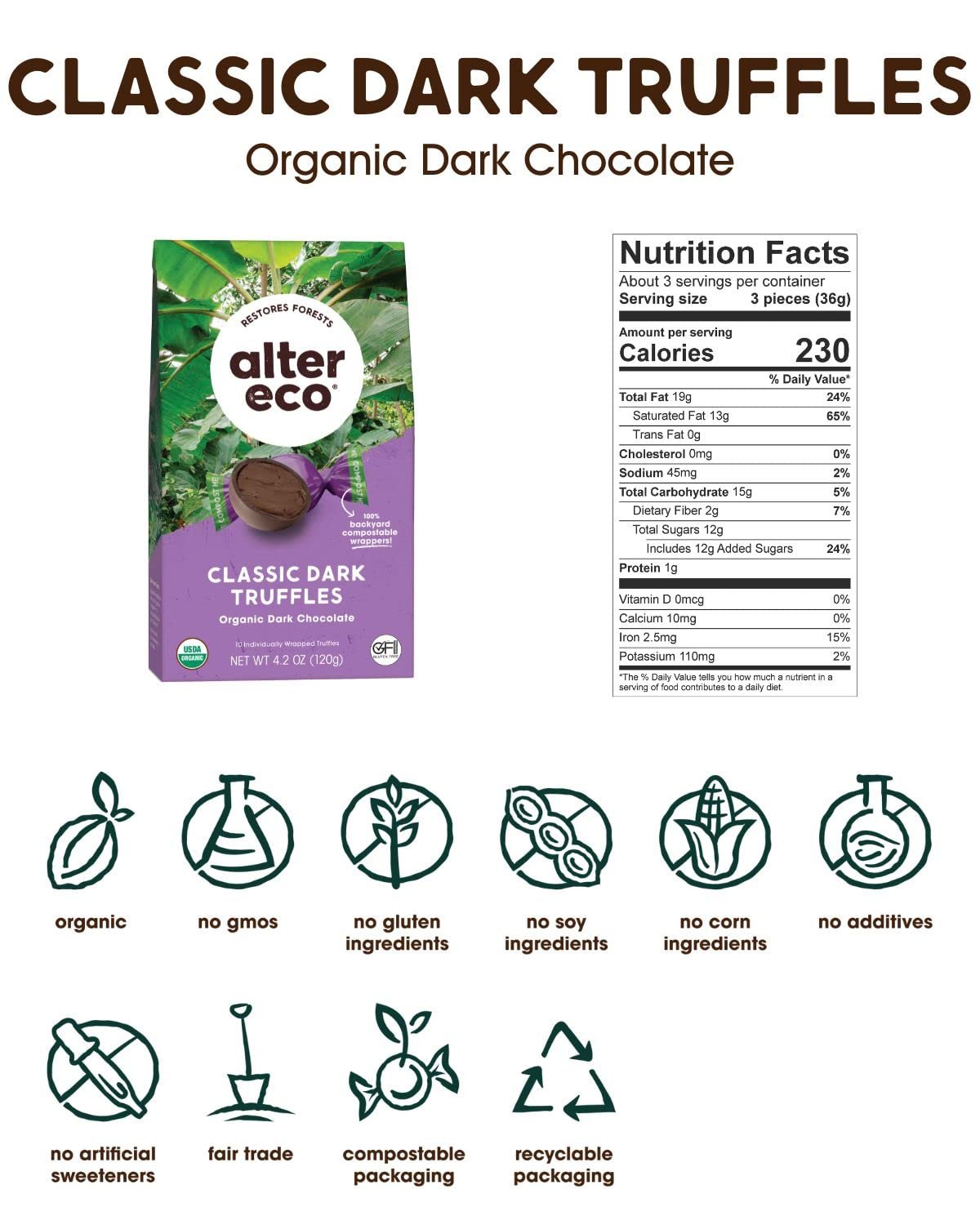 ORGANIC & FAIR TRADE – Certified by the USDA Organic and Fair Trade! Our organic chocolate starts at the soil, and is finished with FSC Certified recyclable packaging.
