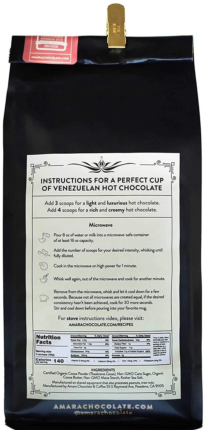 Gran Criollo is the artisan mix from Amara Café in Pasadena-California, to our hot chocolate lovers. The blend is prepared especially for you in small batches, with the meticulousness and expert supervision of Amara Barroeta, a Venezuelan chemical engineer and passionate chocolatier who created her unique formula. Crafted from the finest cocoa beans and premium ingredients, this hot chocolate portraits an array of aromas, rich texture and dark-red full body that will transport you to the 18th century Caracas haciendas or to the cosmopolitan cafes in Madrid or Paris. Gran Criollo could be mixed with milk or water and easily made in the microwave or in the stove.