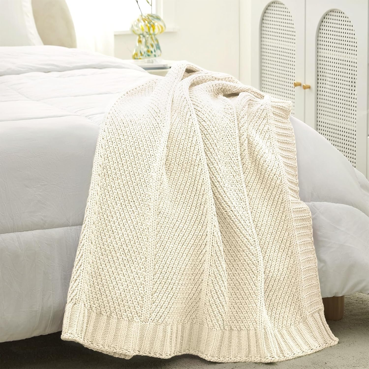 CLASSIC FASHIONABLE DESIGN: Woven into a luxurious chunky knit shows a perfect display of neutral artistry through stylish design features. Classic chevron Texture with striped edging create a visual rhythm and a comfortable hand feel. This cream throw blanket is a great choice farmhouse chic home décor.