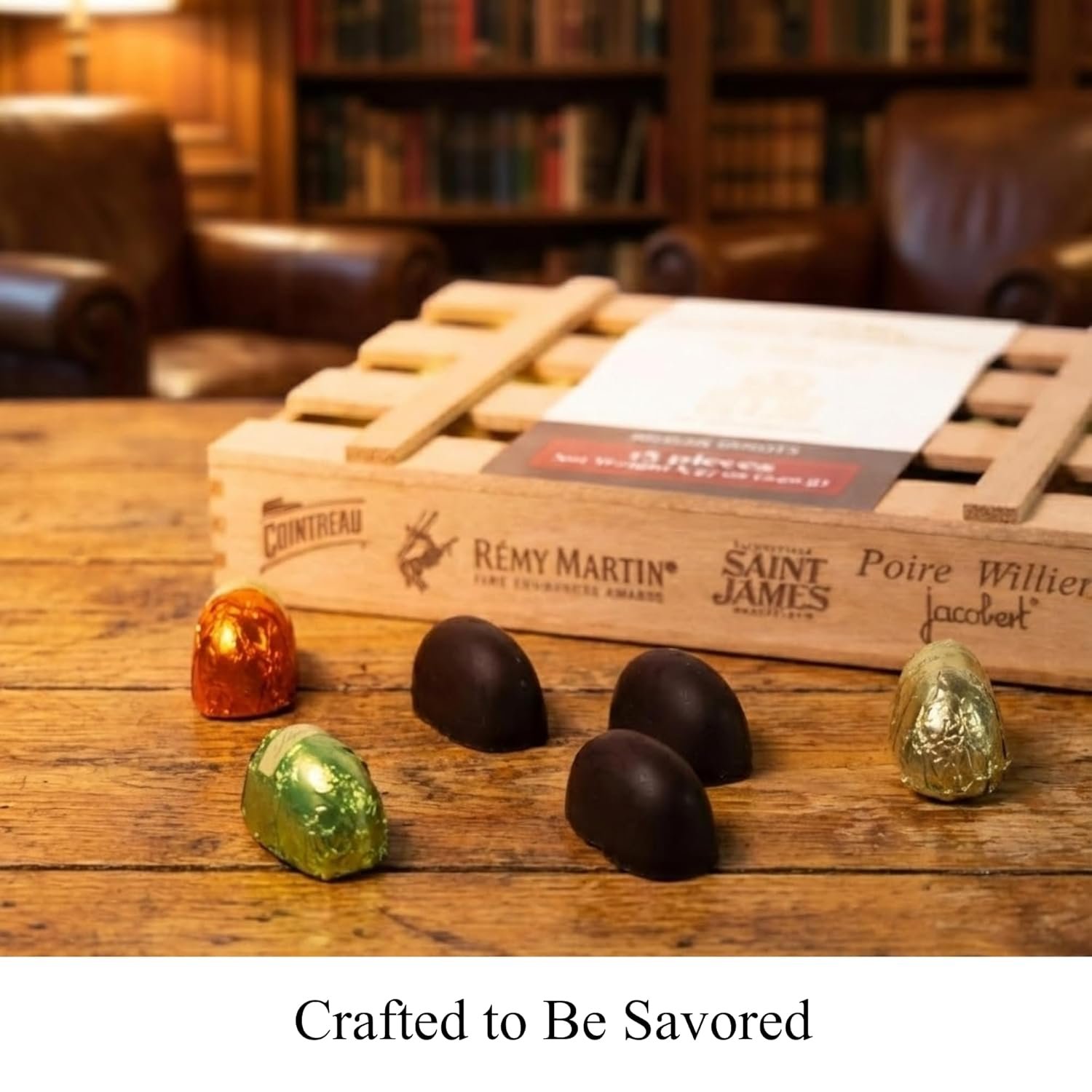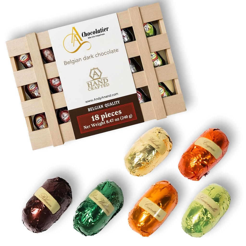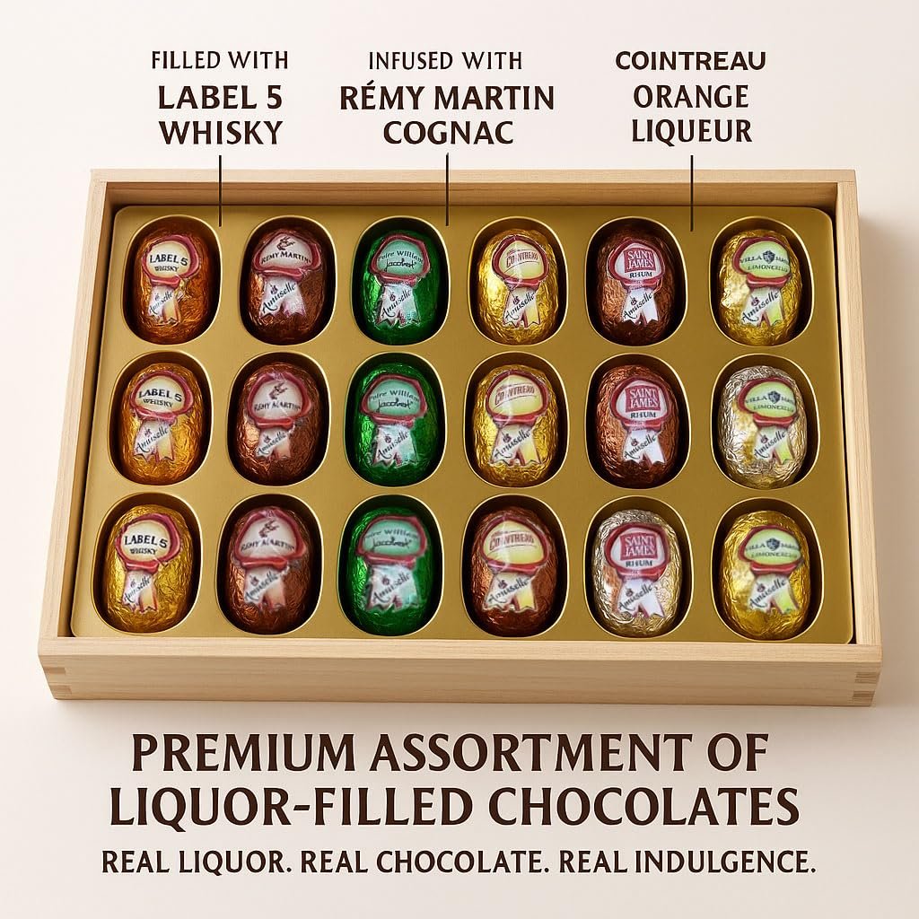 SOPHISTICATED INDULGENCE IN EVERY BITE: Enjoy an exquisite assortment of 18 dark chocolate bottle confections with smooth, flavor-inspired centers, elegantly arranged in a wooden gift box for a refined gourmet experience.