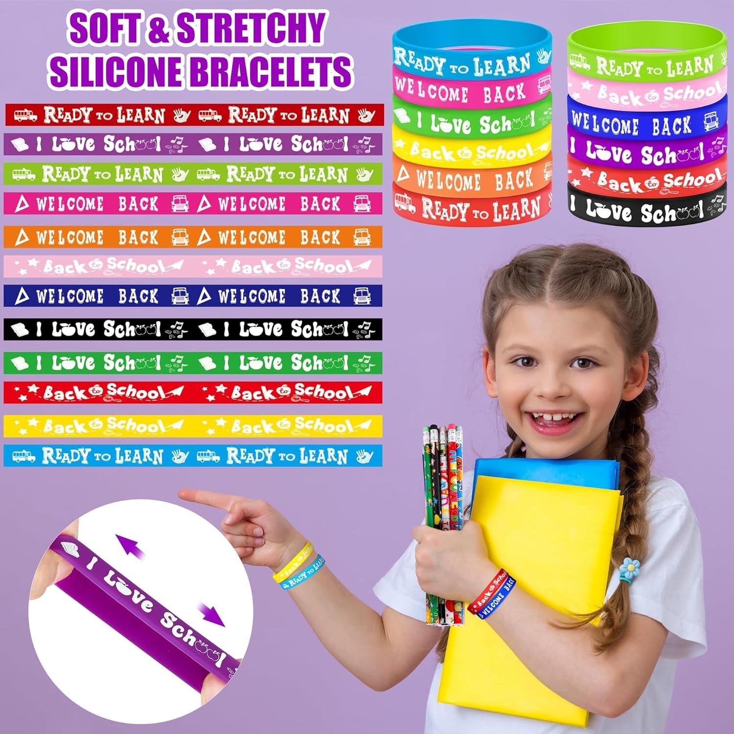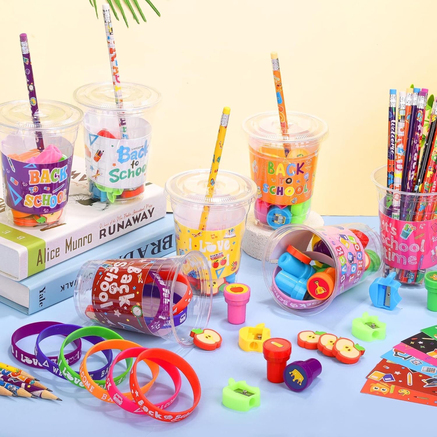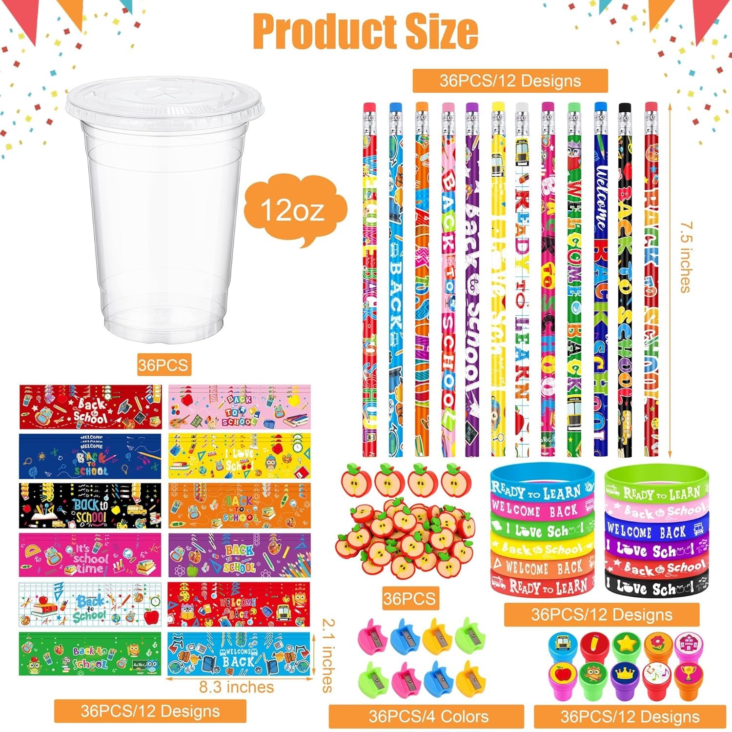 Back-to-school stationery set: you will receive 36 back-to-school gift cards in 12 styles, 36 welcome school stamps in 12 styles, 36 apple-shaped erasers, 36 sharpeners in 4 colors, 36 silicone wristbands in 12 styles, 36 wooden pencils in 12 styles, and 36 transparent plastic cups with lids