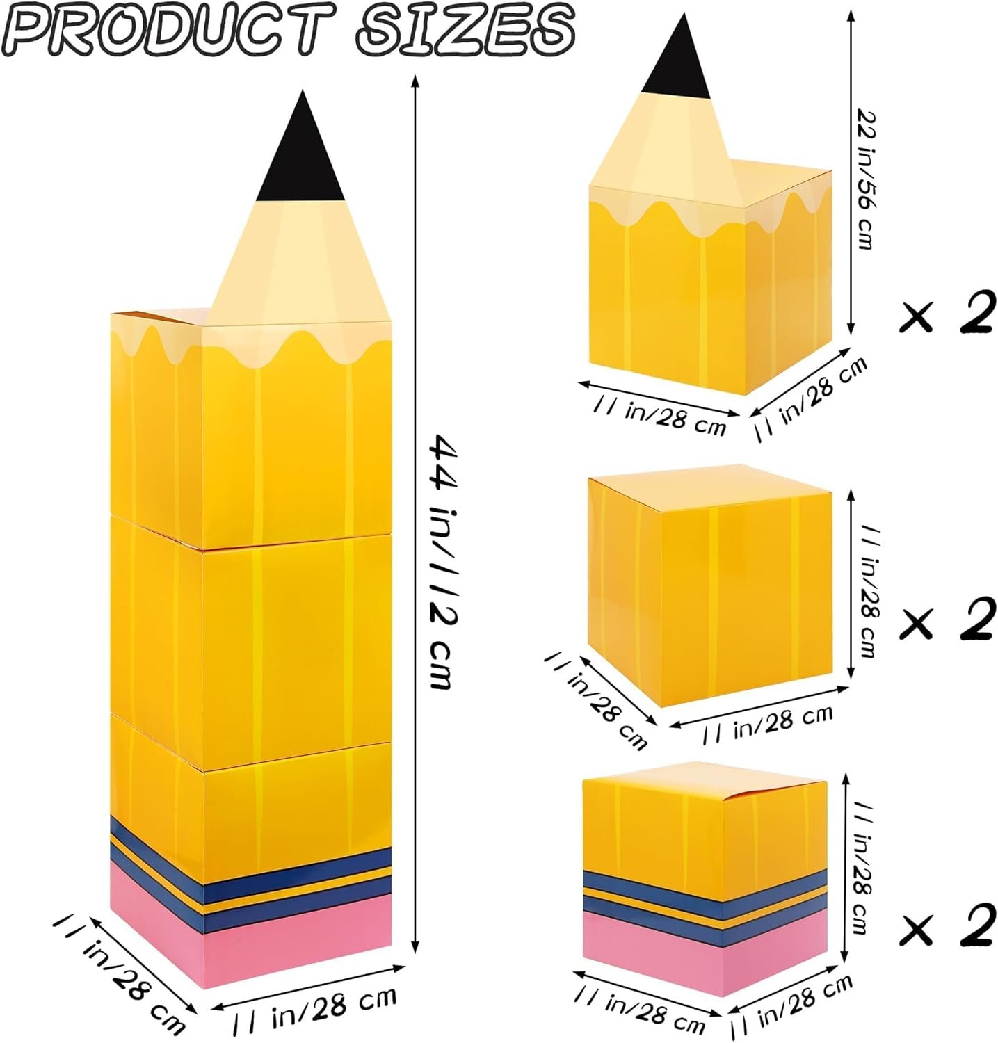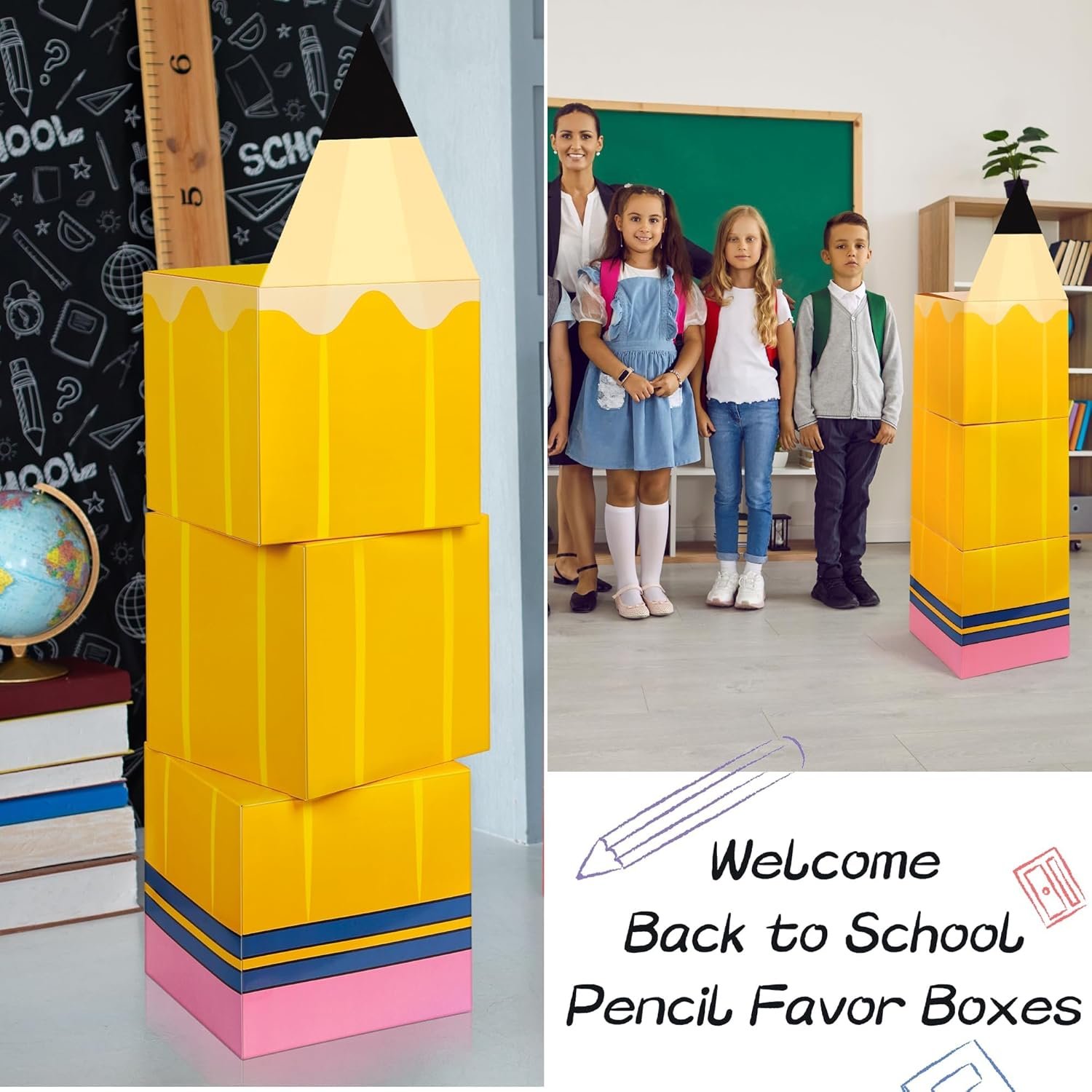 Vibrant Set: our back to school pencil favor boxes set includes 6 party favor boxes in 3 unique, vibrant pencil-inspired designs; each box measures approx. 11 x 11 x 11 inches, giving ample room for planning your party gifts