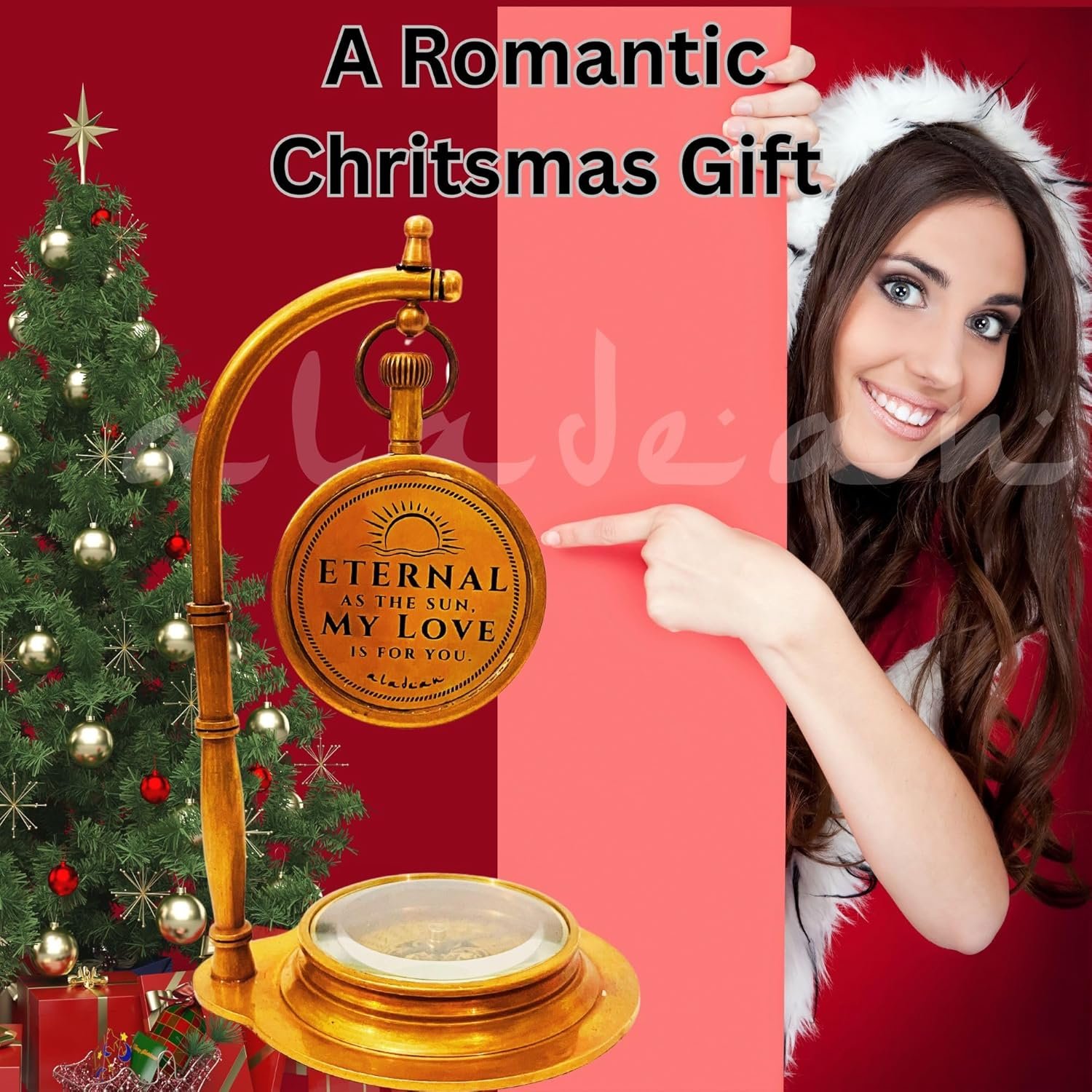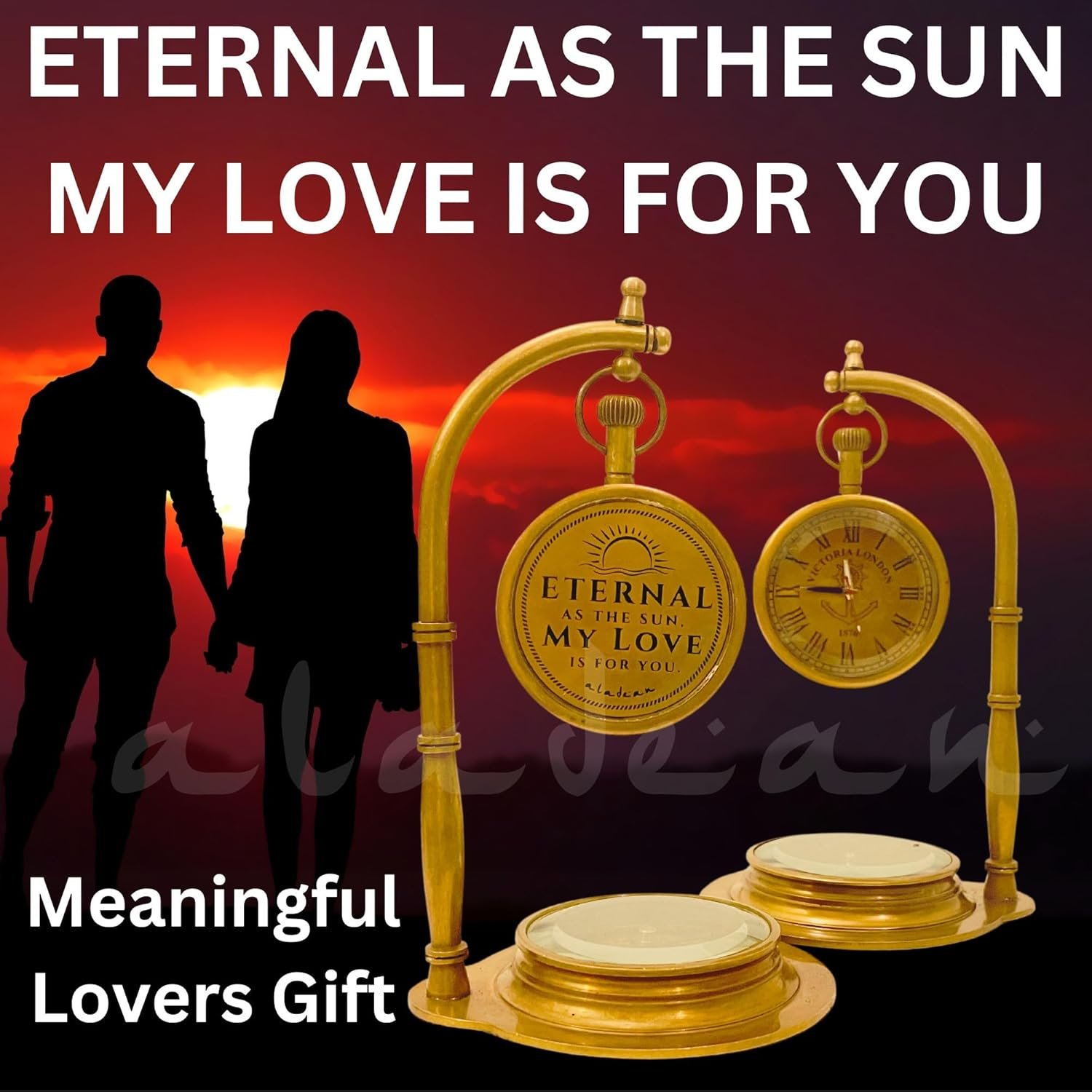 Eternal Love Neo Anniversary Table Clock Compass | Romantic Gift for Him Her Celebrate love that shines as bright as the sun with Aladean’s Eternal Love Neo Anniversary Table Clock Compass. This beautifully handcrafted brass table clock is a timeless keepsake designed to reflect the enduring nature of true love. Its vintage nautical style and functional compass make it a unique and meaningful gift for celebrating milestone moments like your 50th, 40th, 25th, or 20th wedding anniversary. The clock, measuring approximately 3.5 x 3 x 5.5 inches (8.9 x 7.6 x 14 cm), features both a 2-inch mechanical timepiece and a 2-inch functional compass, adding both practicality and elegance to any desk, shelf, or tabletop. Its sleek brass construction ensures durability, while its design is a stunning display of craftsmanship and care. What makes the Eternal Love Neo model truly special is the heartfelt quote engraved on the back: “Eternal as the sun my love is for you.” This beautiful message resonates with everlasting love and warmth, making it a perfect gift for husbands, wives, boyfriends, girlfriends, and romantic couples. It serves as a daily reminder of the strength and brightness of your relationship, a symbol of love that never fades. This versatile gift is ideal for more than just anniversaries. It’s perfect for celebrating Valentine’s Day, birthdays, housewarmings, Christmas, Thanksgiving, or any special occasion. Whether you’re giving this to a partner or gifting it to family members like sons, grandsons, nephews, or daughters-in-law, this clock will leave a lasting impression, reminding them of how much they are cherished. Key Features: Engraved Romantic Quote: “Eternal as the sun my love is for you” – a touching expression of unwavering affection and love. Handcrafted Brass Design: Durable, elegant brass with a vintage nautical aesthetic, perfect for home or office décor. Functional Compass & Clock: Both a working 2-inch compass and a 2-inch mechanical timepiece, blending sentimentality with practicality. Compact & Stylish: Sized at 3.5 x 3 x 5.5 inches, making it a beautiful display piece for any shelf, desk, or mantel. Versatile Gifting: Ideal for milestone anniversaries, Valentine’s Day, birthdays, Christmas, and more. Perfect for Loved Ones: A thoughtful gift for husbands, wives, sons, grandsons, and anyone you want to express your love for. This Eternal Love Neo Table Clock Compass is more than just a clock; it’s a symbol of love that endures forever, just like the sun. Make your next celebration unforgettable by gifting this sentimental and timeless piece to someone you love.