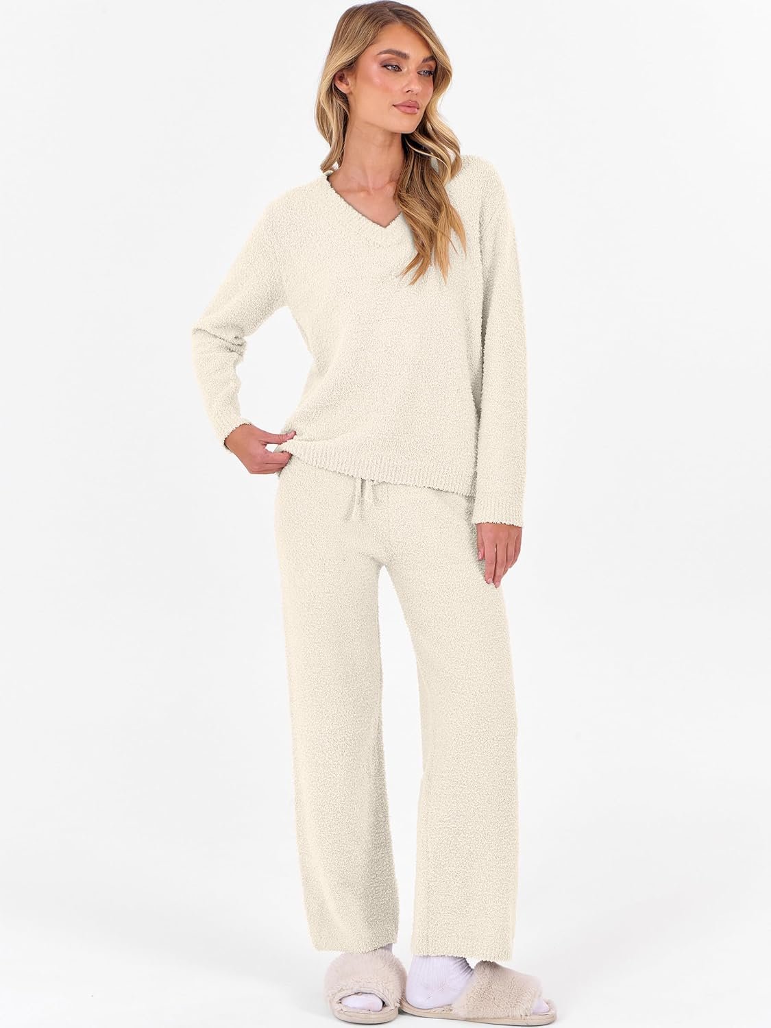 The video showcases the product in use.The video guides you through product setup.The video compares multiple products.The video shows the product being unpacked. Lounge Sets for Women Fuzzy Fleece Pajama Sets Merchant Video