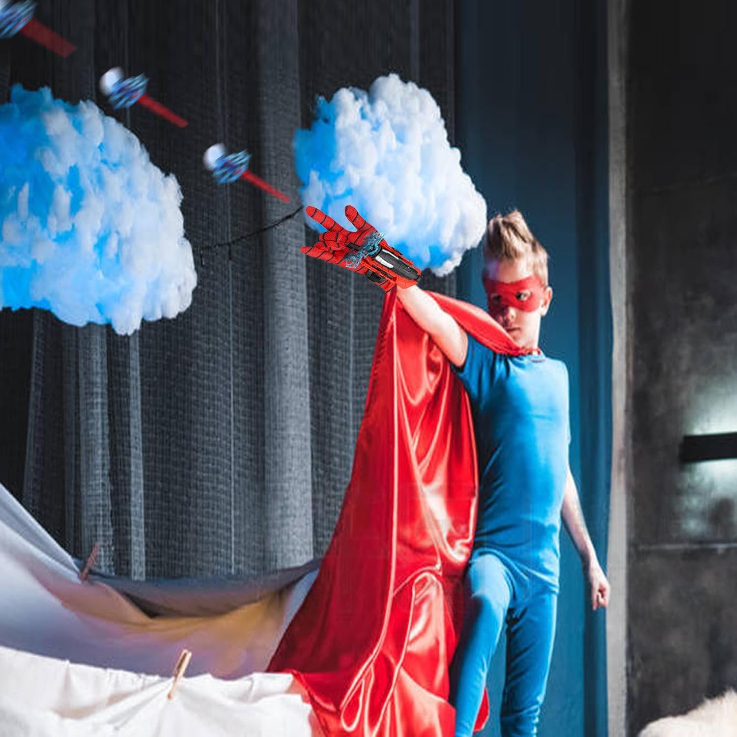 Hero-Launcher Set : Our Spider web shooter includes 2* glove, 2* shooter, 2 rope, 12* suction cup darts, and a flexible wristband. one size appropriate for many children twelve and under. Gloves Size:8.6*3.5 inch. When they put it on, they can mimic the scene of webs shooting like the Spider-Man in movies, allowing kids to imagine themselves as superheroes.