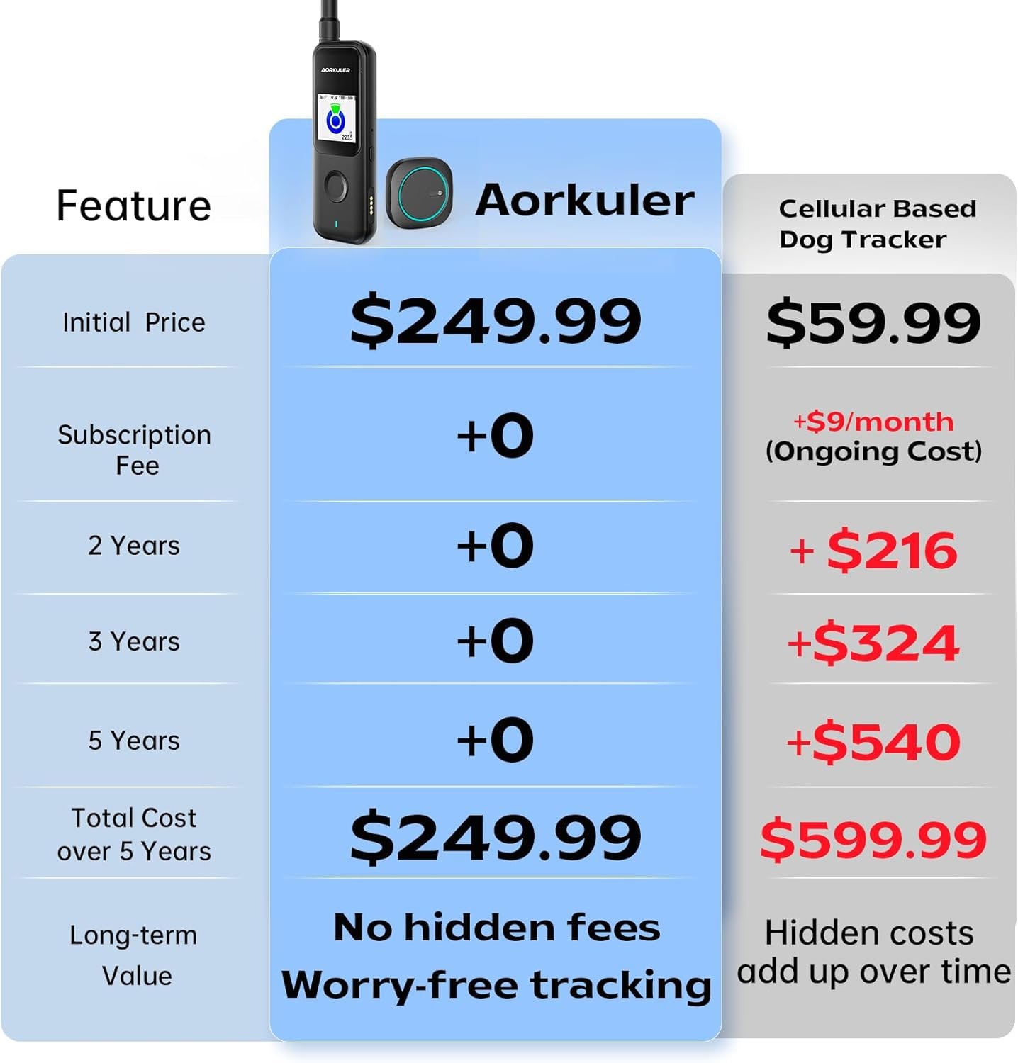 Aorkuler is a one-time purchase with free lifetime usage, unlike other trackers that depend on mobile networks and require ongoing monthly or yearly subscription fees to use. Additionally, some brands charge extra fees through their apps.