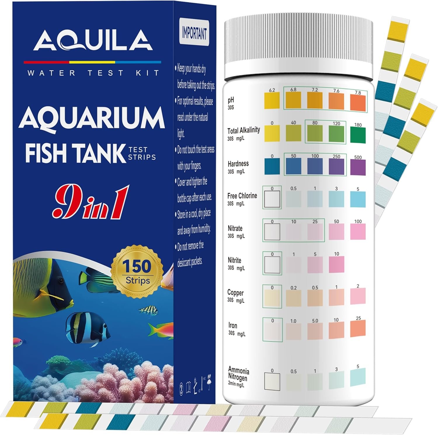 COMPREHENSIVE AQUARIUM WATER TESTING: 9-in-1 water testing strips kit measures pH, total alkalinity, hardness, chlorine, nitrite, sulfate, copper, iron, and ammonia levels in your aquarium water