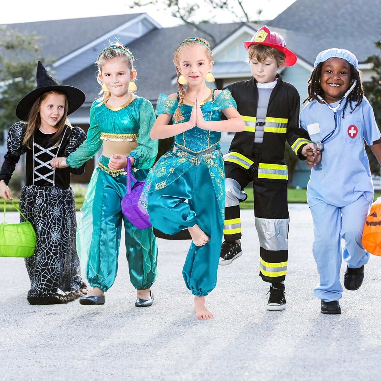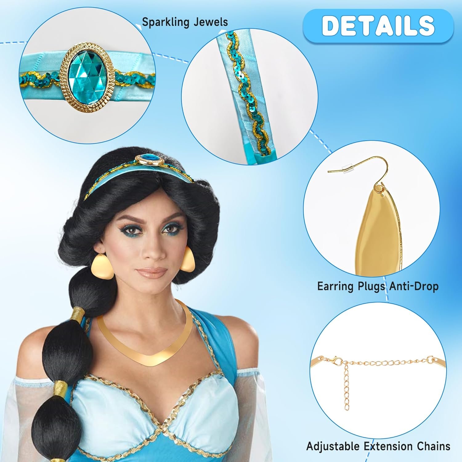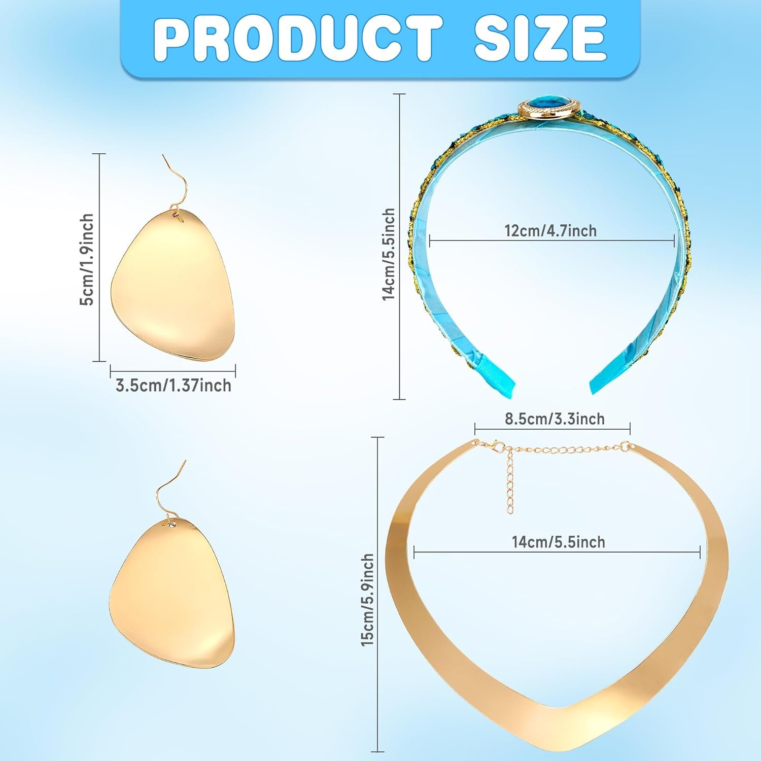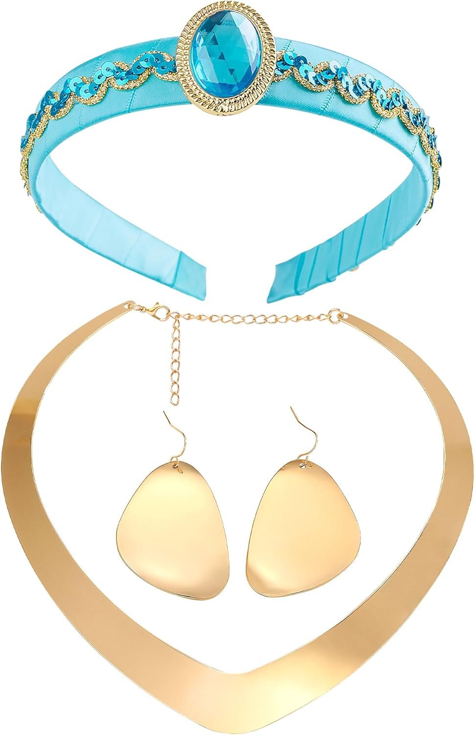 This princess set accessory includes a beautiful princess hair band, a gold collar necklace and a pair of teardrop metal earrings, perfect for everyday wear or as a dress up prop for a princess party, easy to match with your princess costume to complete your look. This Arabian Princess costume accessory set is perfect for a variety of occasions, whether it’s for a cosplay party, Halloween, a princess costume, or just for everyday use, you can add the finishing touch to your look.