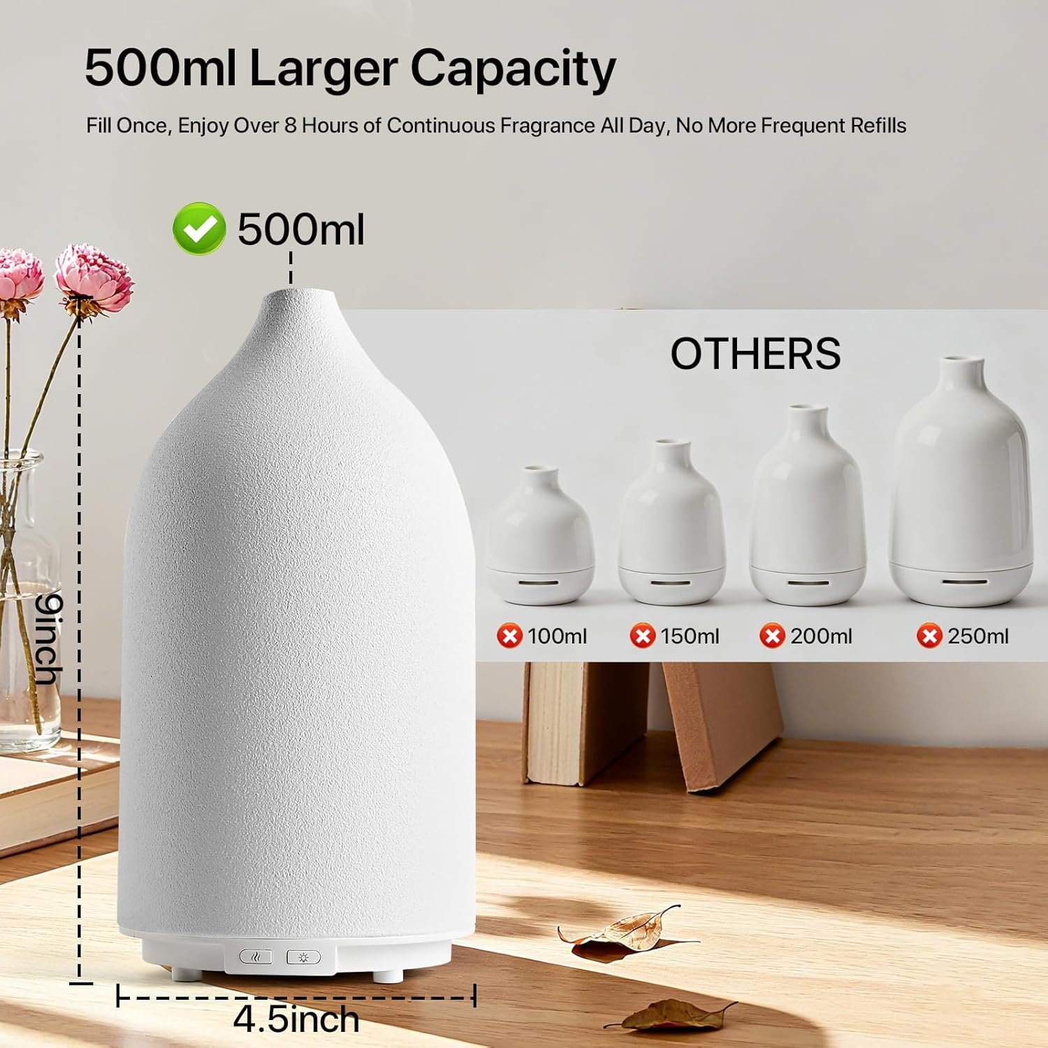 【500ML Large Capacity】:This 500ML essential oil diffuser runs up to 10 hours, paired with a built-in timer (1/3/6/10H) and 7-color LED light for a customizable experience.