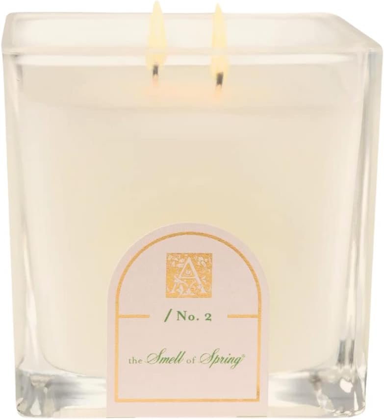 Aromatique’s The Smell of Spring Cube Candle features a pure white colored candle poured into a clear glass cube.