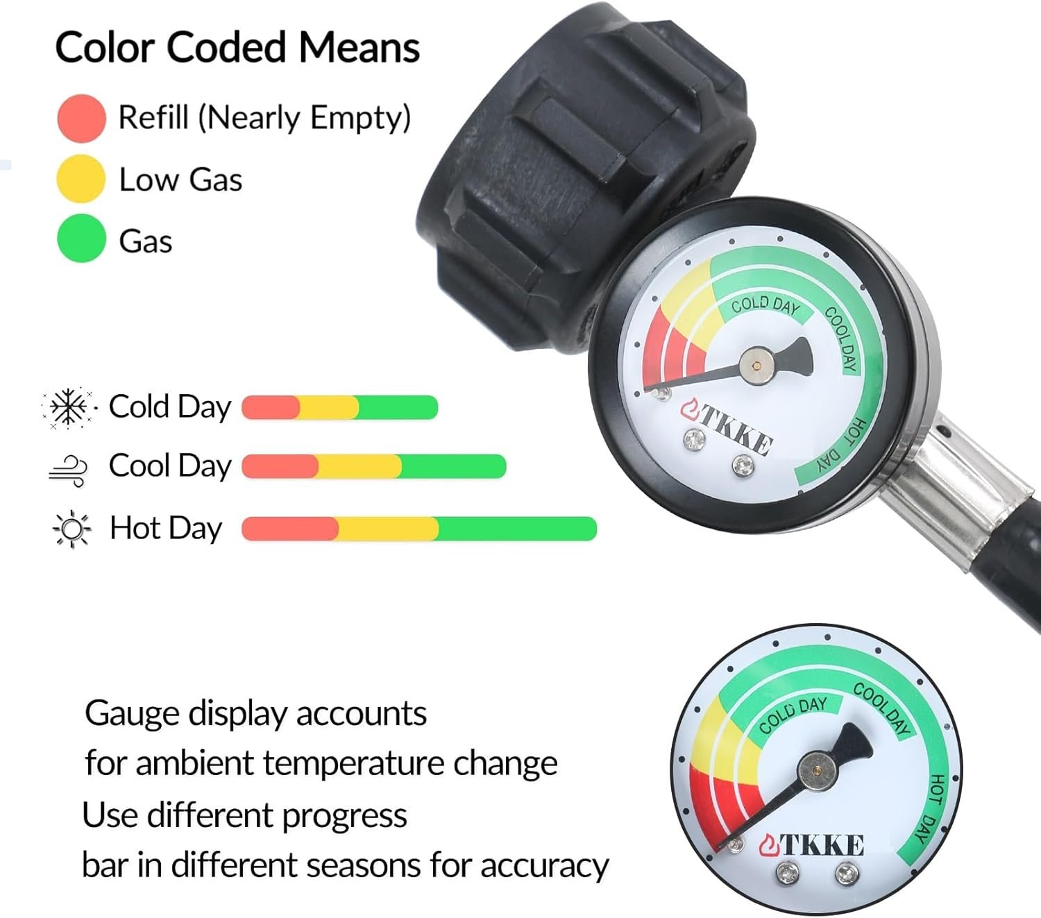 UPGRADED GAS GAUGE FOR MONITERING FUEL LEVEL AT A GLANCE – Saves your money on buying an extra propane gauge. The built-in upgraded tank gauge level indicator allows you to monitor the fuel level without necessarily removing the tank. Gauge display accounts for ambient temperature change. One glance at the large color-coded dial will tell you whether you’re in the red (empty), yellow (low) or green (sufficient).