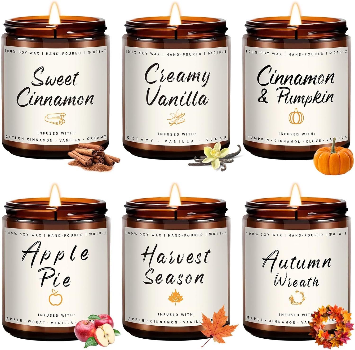 🍁Fall Scents Candles Set: Celebrate the warm scent of fall with this package of 6 candles in cherished autumn scented – Autumn Wreath, Harvest Season, Apple Pie, Cinnamon and Pumpkin, Creamy Vanilla, Sweet Cinnamo. This fall candle collection fills your space with the unique charm of autumn and seasonal memories.