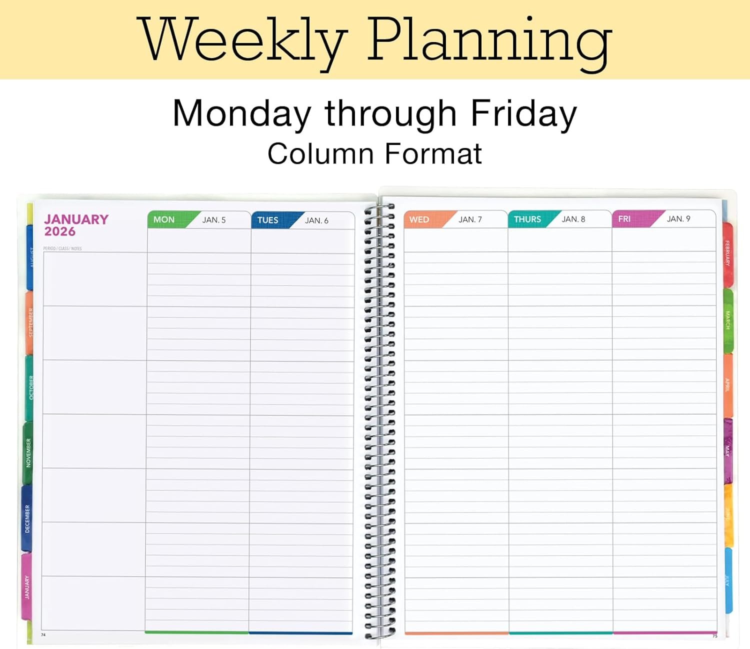Our Deluxe Teacher Planners include both monthly and weekly planning spreads. The weekly planning pages have a Monday through Friday matrix-style layout and include space for up to 7 periods. The dated version has tabs by month from August through July and includes additional notes pages before and after each month. The undated version has a tabbed section for all monthly spreads, followed by a tabbed section for all the weekly spreads.