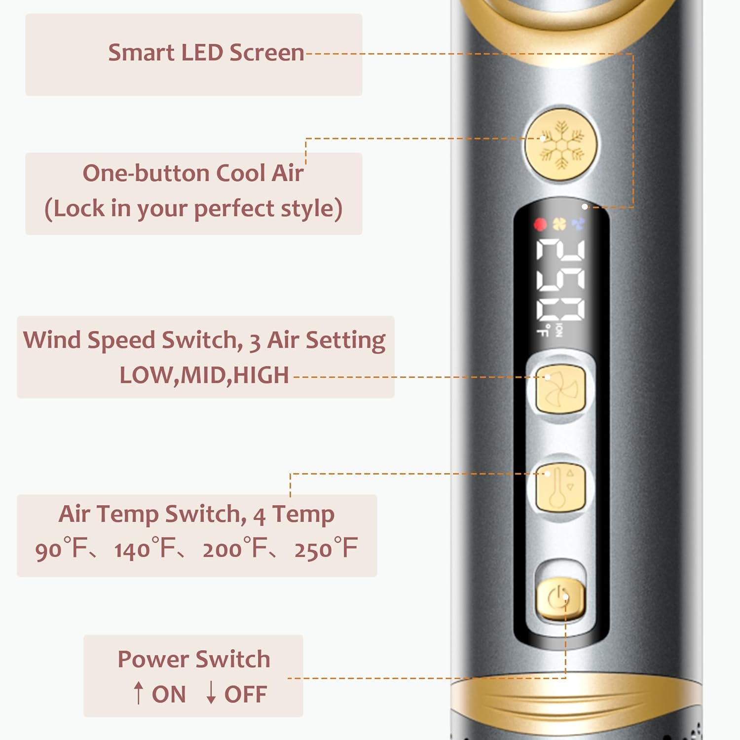 Smart Led Screen & Easy To Use: The blow dryer brush has 4 temperature seetings(90℉、140℉、200℉、250℉) and 3 airflow adjustments (low-medium-high). One-button Cool Air allows the airbrush hair styler 5 in 1 to blow high-speed cool air in 1 sec. Lock in your perfect style